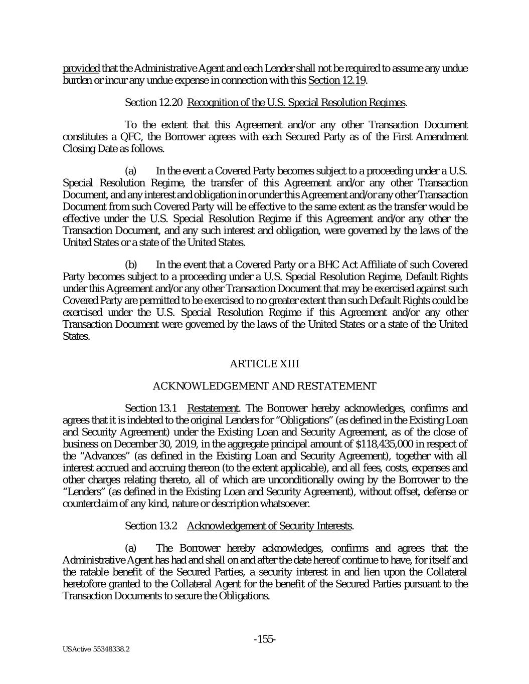 provided that the Administrative Agent and each Lender shall not be required to assume any undue burden or incur any undue expense in connection with this Section 12.19. Section 12.20 Recognition of the U.S. Special Resolution Regimes. To the extent that this Agreement and/or any other Transaction Document constitutes a QFC, the Borrower agrees with each Secured Party as of the First Amendment Closing Date as follows. (a) In the event a Covered Party becomes subject to a proceeding under a U.S. Special Resolution Regime, the transfer of this Agreement and/or any other Transaction Document, and any interest and obligation in or under this Agreement and/or any other Transaction Document from such Covered Party will be effective to the same extent as the transfer would be effective under the U.S. Special Resolution Regime if this Agreement and/or any other the Transaction Document, and any such interest and obligation, were governed by the laws of the United States or a state of the United States. (b) In the event that a Covered Party or a BHC Act Affiliate of such Covered Party becomes subject to a proceeding under a U.S. Special Resolution Regime, Default Rights under this Agreement and/or any other Transaction Document that may be exercised against such Covered Party are permitted to be exercised to no greater extent than such Default Rights could be exercised under the U.S. Special Resolution Regime if this Agreement and/or any other Transaction Document were governed by the laws of the United States or a state of the United States. ARTICLE XIII ACKNOWLEDGEMENT AND RESTATEMENT Section 13.1 Restatement. The Borrower hereby acknowledges, confirms and agrees that it is indebted to the original Lenders for “Obligations” (as defined in the Existing Loan and Security Agreement) under the Existing Loan and Security Agreement, as of the close of business on December 30, 2019, in the aggregate principal amount of $118,435,000 in respect of the “Advances” (as defined in the Existing Loan and Security Agreement), together with all interest accrued and accruing thereon (to the extent applicable), and all fees, costs, expenses and other charges relating thereto, all of which are unconditionally owing by the Borrower to the “Lenders” (as defined in the Existing Loan and Security Agreement), without offset, defense or counterclaim of any kind, nature or description whatsoever. Section 13.2 Acknowledgement of Security Interests. (a) The Borrower hereby acknowledges, confirms and agrees that the Administrative Agent has had and shall on and after the date hereof continue to have, for itself and the ratable benefit of the Secured Parties, a security interest in and lien upon the Collateral heretofore granted to the Collateral Agent for the benefit of the Secured Parties pursuant to the Transaction Documents to secure the Obligations. -155- USActive 55348338.2
