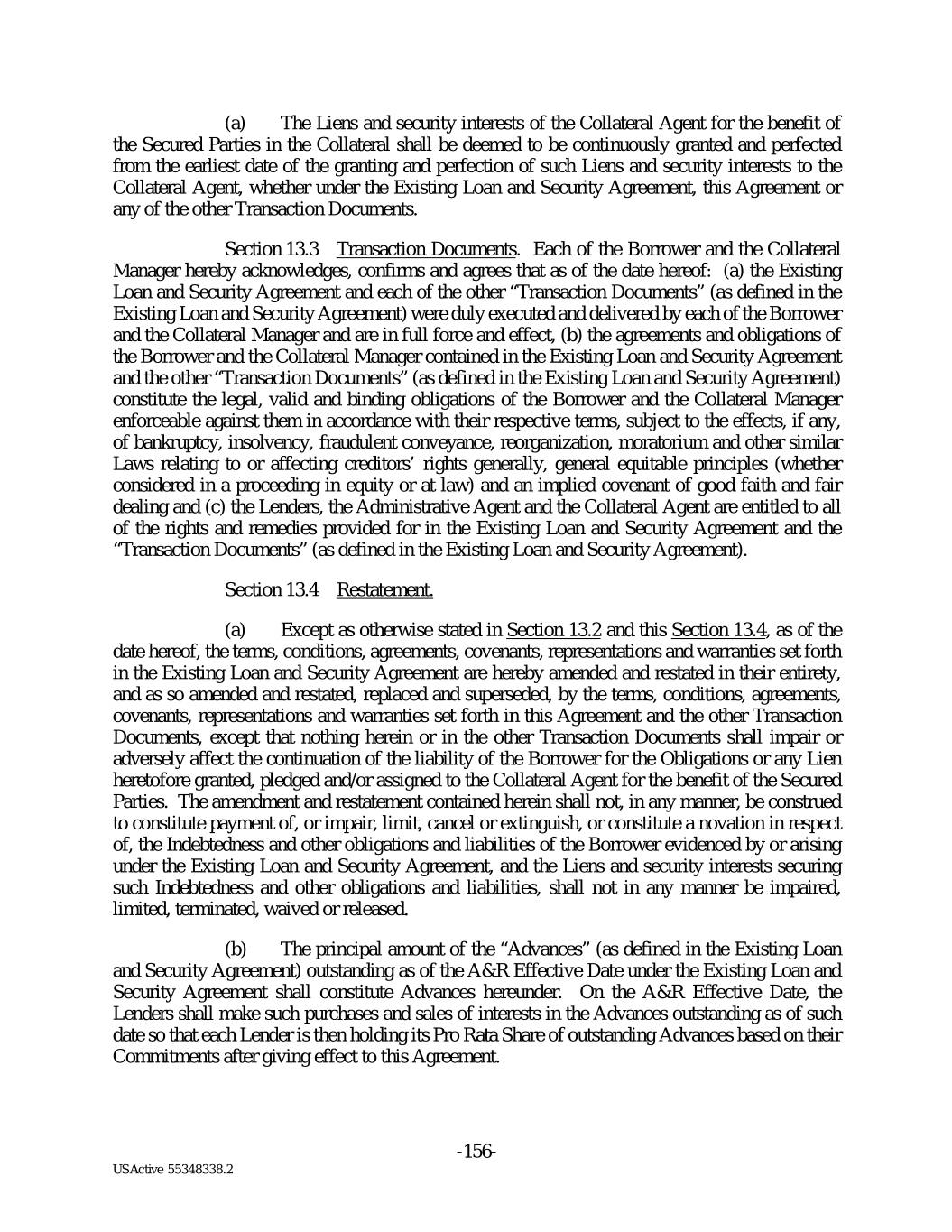 (a) The Liens and security interests of the Collateral Agent for the benefit of the Secured Parties in the Collateral shall be deemed to be continuously granted and perfected from the earliest date of the granting and perfection of such Liens and security interests to the Collateral Agent, whether under the Existing Loan and Security Agreement, this Agreement or any of the other Transaction Documents. Section 13.3 Transaction Documents. Each of the Borrower and the Collateral Manager hereby acknowledges, confirms and agrees that as of the date hereof: (a) the Existing Loan and Security Agreement and each of the other “Transaction Documents” (as defined in the Existing Loan and Security Agreement) were duly executed and delivered by each of the Borrower and the Collateral Manager and are in full force and effect, (b) the agreements and obligations of the Borrower and the Collateral Manager contained in the Existing Loan and Security Agreement and the other “Transaction Documents” (as defined in the Existing Loan and Security Agreement) constitute the legal, valid and binding obligations of the Borrower and the Collateral Manager enforceable against them in accordance with their respective terms, subject to the effects, if any, of bankruptcy, insolvency, fraudulent conveyance, reorganization, moratorium and other similar Laws relating to or affecting creditors’ rights generally, general equitable principles (whether considered in a proceeding in equity or at law) and an implied covenant of good faith and fair dealing and (c) the Lenders, the Administrative Agent and the Collateral Agent are entitled to all of the rights and remedies provided for in the Existing Loan and Security Agreement and the “Transaction Documents” (as defined in the Existing Loan and Security Agreement). Section 13.4 Restatement. (a) Except as otherwise stated in Section 13.2 and this Section 13.4, as of the date hereof, the terms, conditions, agreements, covenants, representations and warranties set forth in the Existing Loan and Security Agreement are hereby amended and restated in their entirety, and as so amended and restated, replaced and superseded, by the terms, conditions, agreements, covenants, representations and warranties set forth in this Agreement and the other Transaction Documents, except that nothing herein or in the other Transaction Documents shall impair or adversely affect the continuation of the liability of the Borrower for the Obligations or any Lien heretofore granted, pledged and/or assigned to the Collateral Agent for the benefit of the Secured Parties. The amendment and restatement contained herein shall not, in any manner, be construed to constitute payment of, or impair, limit, cancel or extinguish, or constitute a novation in respect of, the Indebtedness and other obligations and liabilities of the Borrower evidenced by or arising under the Existing Loan and Security Agreement, and the Liens and security interests securing such Indebtedness and other obligations and liabilities, shall not in any manner be impaired, limited, terminated, waived or released. (b) The principal amount of the “Advances” (as defined in the Existing Loan and Security Agreement) outstanding as of the A&R Effective Date under the Existing Loan and Security Agreement shall constitute Advances hereunder. On the A&R Effective Date, the Lenders shall make such purchases and sales of interests in the Advances outstanding as of such date so that each Lender is then holding its Pro Rata Share of outstanding Advances based on their Commitments after giving effect to this Agreement. -156- USActive 55348338.2