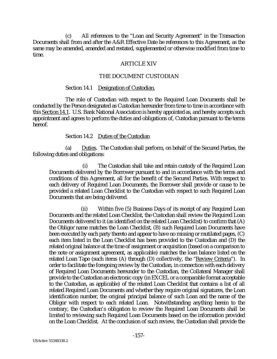 (c) All references to the “Loan and Security Agreement” in the Transaction Documents shall from and after the A&R Effective Date be references to this Agreement, as the same may be amended, amended and restated, supplemented or otherwise modified from time to time. ARTICLE XIV THE DOCUMENT CUSTODIAN Section 14.1 Designation of Custodian. The role of Custodian with respect to the Required Loan Documents shall be conducted by the Person designated as Custodian hereunder from time to time in accordance with this Section 14.1. U.S. Bank National Association is hereby appointed as, and hereby accepts such appointment and agrees to perform the duties and obligations of, Custodian pursuant to the terms hereof. Section 14.2 Duties of the Custodian (a) Duties. The Custodian shall perform, on behalf of the Secured Parties, the following duties and obligations: (i) The Custodian shall take and retain custody of the Required Loan Documents delivered by the Borrower pursuant to and in accordance with the terms and conditions of this Agreement, all for the benefit of the Secured Parties. With respect to each delivery of Required Loan Documents, the Borrower shall provide or cause to be provided a related Loan Checklist to the Custodian with respect to such Required Loan Documents that are being delivered. (ii) Within five (5) Business Days of its receipt of any Required Loan Documents and the related Loan Checklist, the Custodian shall review the Required Loan Documents delivered to it (as identified on the related Loan Checklist) to confirm that (A) the Obligor name matches the Loan Checklist, (B) such Required Loan Documents have been executed by each party thereto and appear to have no missing or mutilated pages, (C) each item listed in the Loan Checklist has been provided to the Custodian and (D) the related original balance at the time of assignment or acquisition (based on a comparison to the note or assignment agreement, as applicable) matches the loan balance listed on the related Loan Tape (such items (A) through (D) collectively, the “Review Criteria”). In order to facilitate the foregoing review by the Custodian, in connection with each delivery of Required Loan Documents hereunder to the Custodian, the Collateral Manager shall provide to the Custodian an electronic copy (in EXCEL or a comparable format acceptable to the Custodian, as applicable) of the related Loan Checklist that contains a list of all related Required Loan Documents and whether they require original signatures, the Loan identification number, the original principal balance of such Loan and the name of the Obligor with respect to each related Loan. Notwithstanding anything herein to the contrary, the Custodian’s obligation to review the Required Loan Documents shall be limited to reviewing such Required Loan Documents based on the information provided on the Loan Checklist. At the conclusion of such review, the Custodian shall provide the -157- USActive 55348338.2
