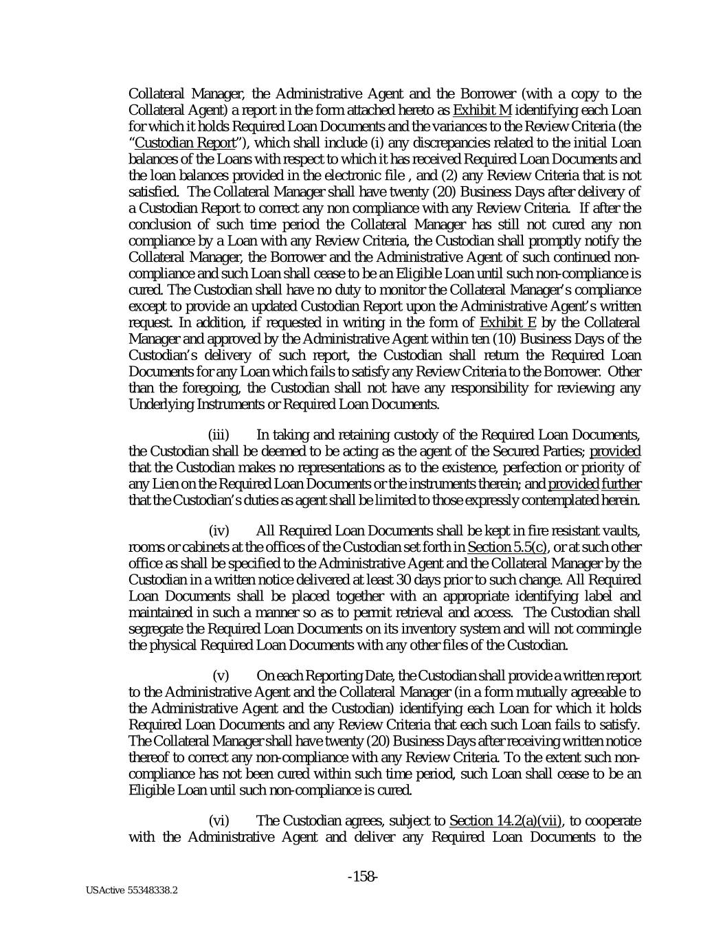 Collateral Manager, the Administrative Agent and the Borrower (with a copy to the Collateral Agent) a report in the form attached hereto as Exhibit M identifying each Loan for which it holds Required Loan Documents and the variances to the Review Criteria (the “Custodian Report”), which shall include (i) any discrepancies related to the initial Loan balances of the Loans with respect to which it has received Required Loan Documents and the loan balances provided in the electronic file , and (2) any Review Criteria that is not satisfied. The Collateral Manager shall have twenty (20) Business Days after delivery of a Custodian Report to correct any non compliance with any Review Criteria. If after the conclusion of such time period the Collateral Manager has still not cured any non compliance by a Loan with any Review Criteria, the Custodian shall promptly notify the Collateral Manager, the Borrower and the Administrative Agent of such continued non- compliance and such Loan shall cease to be an Eligible Loan until such non-compliance is cured. The Custodian shall have no duty to monitor the Collateral Manager’s compliance except to provide an updated Custodian Report upon the Administrative Agent’s written request. In addition, if requested in writing in the form of Exhibit E by the Collateral Manager and approved by the Administrative Agent within ten (10) Business Days of the Custodian’s delivery of such report, the Custodian shall return the Required Loan Documents for any Loan which fails to satisfy any Review Criteria to the Borrower. Other than the foregoing, the Custodian shall not have any responsibility for reviewing any Underlying Instruments or Required Loan Documents. (iii) In taking and retaining custody of the Required Loan Documents, the Custodian shall be deemed to be acting as the agent of the Secured Parties; provided that the Custodian makes no representations as to the existence, perfection or priority of any Lien on the Required Loan Documents or the instruments therein; and provided further that the Custodian’s duties as agent shall be limited to those expressly contemplated herein. (iv) All Required Loan Documents shall be kept in fire resistant vaults, rooms or cabinets at the offices of the Custodian set forth in Section 5.5(c), or at such other office as shall be specified to the Administrative Agent and the Collateral Manager by the Custodian in a written notice delivered at least 30 days prior to such change. All Required Loan Documents shall be placed together with an appropriate identifying label and maintained in such a manner so as to permit retrieval and access. The Custodian shall segregate the Required Loan Documents on its inventory system and will not commingle the physical Required Loan Documents with any other files of the Custodian. (v) On each Reporting Date, the Custodian shall provide a written report to the Administrative Agent and the Collateral Manager (in a form mutually agreeable to the Administrative Agent and the Custodian) identifying each Loan for which it holds Required Loan Documents and any Review Criteria that each such Loan fails to satisfy. The Collateral Manager shall have twenty (20) Business Days after receiving written notice thereof to correct any non-compliance with any Review Criteria. To the extent such non- compliance has not been cured within such time period, such Loan shall cease to be an Eligible Loan until such non-compliance is cured. (vi) The Custodian agrees, subject to Section 14.2(a)(vii), to cooperate with the Administrative Agent and deliver any Required Loan Documents to the -158- USActive 55348338.2