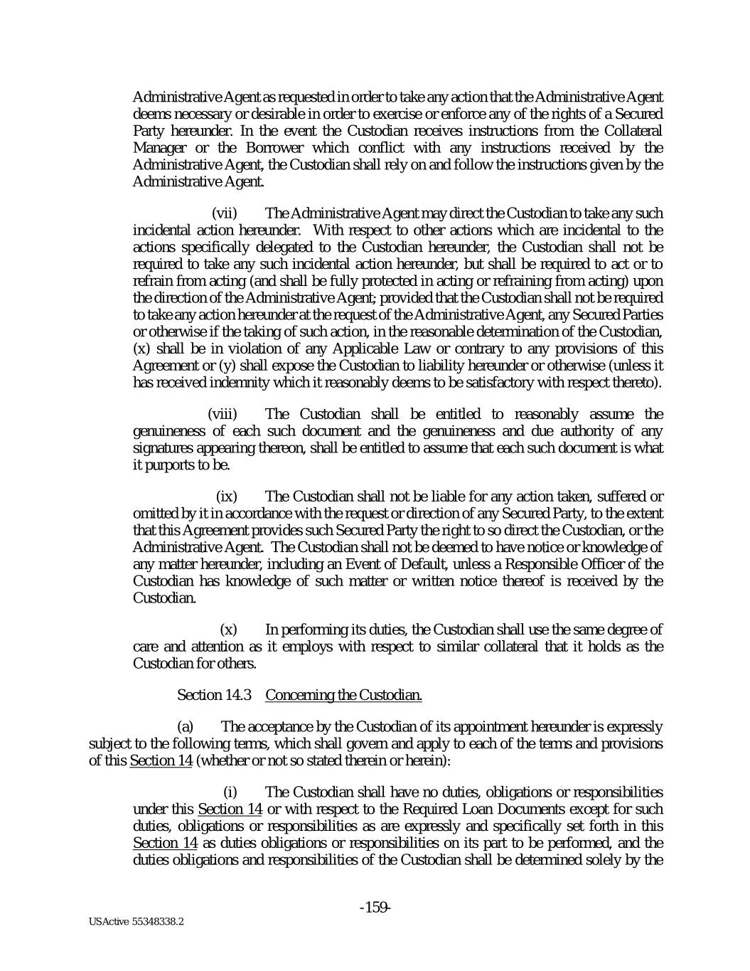 Administrative Agent as requested in order to take any action that the Administrative Agent deems necessary or desirable in order to exercise or enforce any of the rights of a Secured Party hereunder. In the event the Custodian receives instructions from the Collateral Manager or the Borrower which conflict with any instructions received by the Administrative Agent, the Custodian shall rely on and follow the instructions given by the Administrative Agent. (vii) The Administrative Agent may direct the Custodian to take any such incidental action hereunder. With respect to other actions which are incidental to the actions specifically delegated to the Custodian hereunder, the Custodian shall not be required to take any such incidental action hereunder, but shall be required to act or to refrain from acting (and shall be fully protected in acting or refraining from acting) upon the direction of the Administrative Agent; provided that the Custodian shall not be required to take any action hereunder at the request of the Administrative Agent, any Secured Parties or otherwise if the taking of such action, in the reasonable determination of the Custodian, (x) shall be in violation of any Applicable Law or contrary to any provisions of this Agreement or (y) shall expose the Custodian to liability hereunder or otherwise (unless it has received indemnity which it reasonably deems to be satisfactory with respect thereto). (viii) The Custodian shall be entitled to reasonably assume the genuineness of each such document and the genuineness and due authority of any signatures appearing thereon, shall be entitled to assume that each such document is what it purports to be. (ix) The Custodian shall not be liable for any action taken, suffered or omitted by it in accordance with the request or direction of any Secured Party, to the extent that this Agreement provides such Secured Party the right to so direct the Custodian, or the Administrative Agent. The Custodian shall not be deemed to have notice or knowledge of any matter hereunder, including an Event of Default, unless a Responsible Officer of the Custodian has knowledge of such matter or written notice thereof is received by the Custodian. (x) In performing its duties, the Custodian shall use the same degree of care and attention as it employs with respect to similar collateral that it holds as the Custodian for others. Section 14.3 Concerning the Custodian. (a) The acceptance by the Custodian of its appointment hereunder is expressly subject to the following terms, which shall govern and apply to each of the terms and provisions of this Section 14 (whether or not so stated therein or herein): (i) The Custodian shall have no duties, obligations or responsibilities under this Section 14 or with respect to the Required Loan Documents except for such duties, obligations or responsibilities as are expressly and specifically set forth in this Section 14 as duties obligations or responsibilities on its part to be performed, and the duties obligations and responsibilities of the Custodian shall be determined solely by the -159- USActive 55348338.2