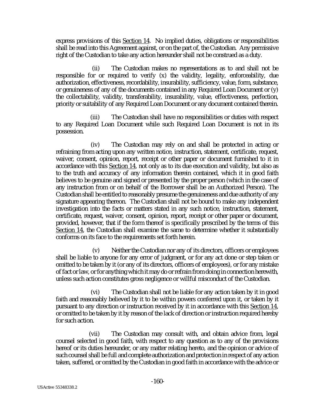 express provisions of this Section 14. No implied duties, obligations or responsibilities shall be read into this Agreement against, or on the part of, the Custodian. Any permissive right of the Custodian to take any action hereunder shall not be construed as a duty. (ii) The Custodian makes no representations as to and shall not be responsible for or required to verify (x) the validity, legality, enforceability, due authorization, effectiveness, recordability, insurability, sufficiency, value, form, substance, or genuineness of any of the documents contained in any Required Loan Document or (y) the collectability, validity, transferability, insurability, value, effectiveness, perfection, priority or suitability of any Required Loan Document or any document contained therein. (iii) The Custodian shall have no responsibilities or duties with respect to any Required Loan Document while such Required Loan Document is not in its possession. (iv) The Custodian may rely on and shall be protected in acting or refraining from acting upon any written notice, instruction, statement, certificate, request, waiver, consent, opinion, report, receipt or other paper or document furnished to it in accordance with this Section 14, not only as to its due execution and validity, but also as to the truth and accuracy of any information therein contained, which it in good faith believes to be genuine and signed or presented by the proper person (which in the case of any instruction from or on behalf of the Borrower shall be an Authorized Person). The Custodian shall be entitled to reasonably presume the genuineness and due authority of any signature appearing thereon. The Custodian shall not be bound to make any independent investigation into the facts or matters stated in any such notice, instruction, statement, certificate, request, waiver, consent, opinion, report, receipt or other paper or document, provided, however, that if the form thereof is specifically prescribed by the terms of this Section 14, the Custodian shall examine the same to determine whether it substantially conforms on its face to the requirements set forth herein. (v) Neither the Custodian nor any of its directors, officers or employees shall be liable to anyone for any error of judgment, or for any act done or step taken or omitted to be taken by it (or any of its directors, officers of employees), or for any mistake of fact or law, or for anything which it may do or refrain from doing in connection herewith, unless such action constitutes gross negligence or willful misconduct of the Custodian. (vi) The Custodian shall not be liable for any action taken by it in good faith and reasonably believed by it to be within powers conferred upon it, or taken by it pursuant to any direction or instruction received by it in accordance with this Section 14, or omitted to be taken by it by reason of the lack of direction or instruction required hereby for such action. (vii) The Custodian may consult with, and obtain advice from, legal counsel selected in good faith, with respect to any question as to any of the provisions hereof or its duties hereunder, or any matter relating hereto, and the opinion or advice of such counsel shall be full and complete authorization and protection in respect of any action taken, suffered, or omitted by the Custodian in good faith in accordance with the advice or -160- USActive 55348338.2