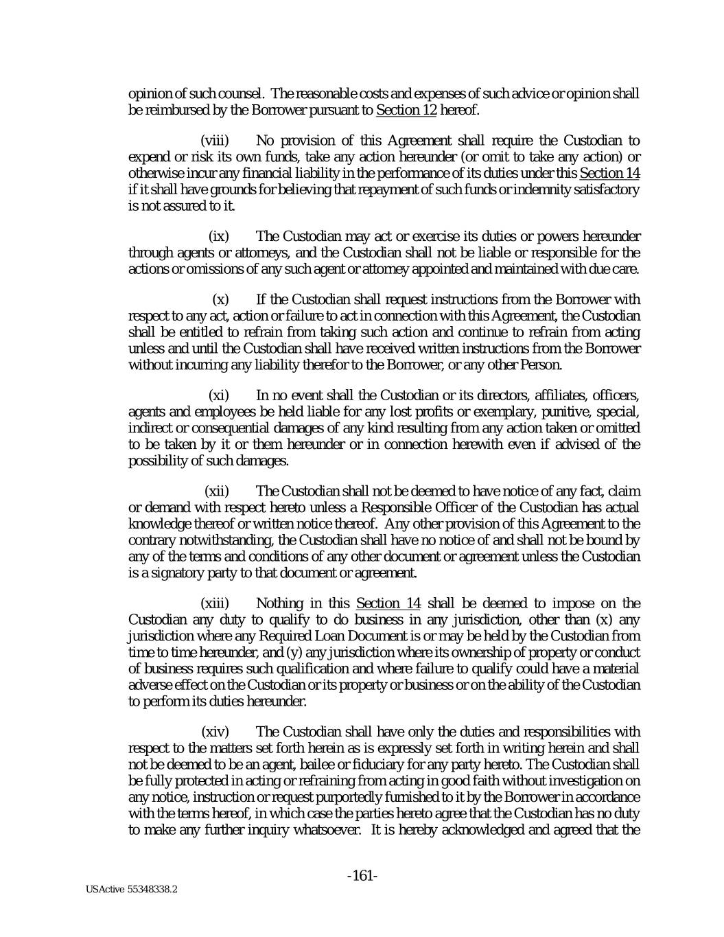 opinion of such counsel. The reasonable costs and expenses of such advice or opinion shall be reimbursed by the Borrower pursuant to Section 12 hereof. (viii) No provision of this Agreement shall require the Custodian to expend or risk its own funds, take any action hereunder (or omit to take any action) or otherwise incur any financial liability in the performance of its duties under this Section 14 if it shall have grounds for believing that repayment of such funds or indemnity satisfactory is not assured to it. (ix) The Custodian may act or exercise its duties or powers hereunder through agents or attorneys, and the Custodian shall not be liable or responsible for the actions or omissions of any such agent or attorney appointed and maintained with due care. (x) If the Custodian shall request instructions from the Borrower with respect to any act, action or failure to act in connection with this Agreement, the Custodian shall be entitled to refrain from taking such action and continue to refrain from acting unless and until the Custodian shall have received written instructions from the Borrower without incurring any liability therefor to the Borrower, or any other Person. (xi) In no event shall the Custodian or its directors, affiliates, officers, agents and employees be held liable for any lost profits or exemplary, punitive, special, indirect or consequential damages of any kind resulting from any action taken or omitted to be taken by it or them hereunder or in connection herewith even if advised of the possibility of such damages. (xii) The Custodian shall not be deemed to have notice of any fact, claim or demand with respect hereto unless a Responsible Officer of the Custodian has actual knowledge thereof or written notice thereof. Any other provision of this Agreement to the contrary notwithstanding, the Custodian shall have no notice of and shall not be bound by any of the terms and conditions of any other document or agreement unless the Custodian is a signatory party to that document or agreement. (xiii) Nothing in this Section 14 shall be deemed to impose on the Custodian any duty to qualify to do business in any jurisdiction, other than (x) any jurisdiction where any Required Loan Document is or may be held by the Custodian from time to time hereunder, and (y) any jurisdiction where its ownership of property or conduct of business requires such qualification and where failure to qualify could have a material adverse effect on the Custodian or its property or business or on the ability of the Custodian to perform its duties hereunder. (xiv) The Custodian shall have only the duties and responsibilities with respect to the matters set forth herein as is expressly set forth in writing herein and shall not be deemed to be an agent, bailee or fiduciary for any party hereto. The Custodian shall be fully protected in acting or refraining from acting in good faith without investigation on any notice, instruction or request purportedly furnished to it by the Borrower in accordance with the terms hereof, in which case the parties hereto agree that the Custodian has no duty to make any further inquiry whatsoever. It is hereby acknowledged and agreed that the -161- USActive 55348338.2