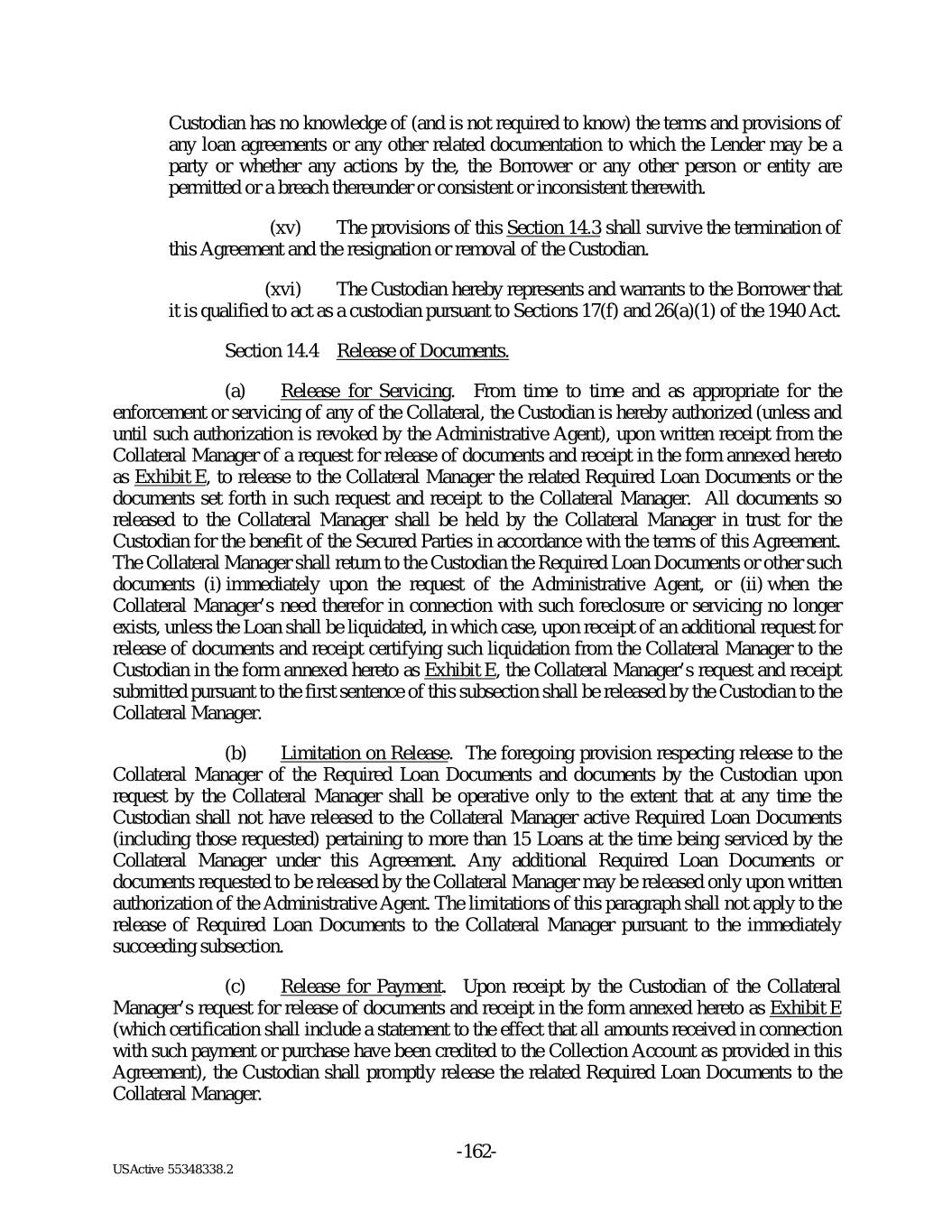 Custodian has no knowledge of (and is not required to know) the terms and provisions of any loan agreements or any other related documentation to which the Lender may be a party or whether any actions by the, the Borrower or any other person or entity are permitted or a breach thereunder or consistent or inconsistent therewith. (xv) The provisions of this Section 14.3 shall survive the termination of this Agreement and the resignation or removal of the Custodian. (xvi) The Custodian hereby represents and warrants to the Borrower that it is qualified to act as a custodian pursuant to Sections 17(f) and 26(a)(1) of the 1940 Act. Section 14.4 Release of Documents. (a) Release for Servicing. From time to time and as appropriate for the enforcement or servicing of any of the Collateral, the Custodian is hereby authorized (unless and until such authorization is revoked by the Administrative Agent), upon written receipt from the Collateral Manager of a request for release of documents and receipt in the form annexed hereto as Exhibit E, to release to the Collateral Manager the related Required Loan Documents or the documents set forth in such request and receipt to the Collateral Manager. All documents so released to the Collateral Manager shall be held by the Collateral Manager in trust for the Custodian for the benefit of the Secured Parties in accordance with the terms of this Agreement. The Collateral Manager shall return to the Custodian the Required Loan Documents or other such documents (i) immediately upon the request of the Administrative Agent, or (ii) when the Collateral Manager’s need therefor in connection with such foreclosure or servicing no longer exists, unless the Loan shall be liquidated, in which case, upon receipt of an additional request for release of documents and receipt certifying such liquidation from the Collateral Manager to the Custodian in the form annexed hereto as Exhibit E, the Collateral Manager’s request and receipt submitted pursuant to the first sentence of this subsection shall be released by the Custodian to the Collateral Manager. (b) Limitation on Release. The foregoing provision respecting release to the Collateral Manager of the Required Loan Documents and documents by the Custodian upon request by the Collateral Manager shall be operative only to the extent that at any time the Custodian shall not have released to the Collateral Manager active Required Loan Documents (including those requested) pertaining to more than 15 Loans at the time being serviced by the Collateral Manager under this Agreement. Any additional Required Loan Documents or documents requested to be released by the Collateral Manager may be released only upon written authorization of the Administrative Agent. The limitations of this paragraph shall not apply to the release of Required Loan Documents to the Collateral Manager pursuant to the immediately succeeding subsection. (c) Release for Payment. Upon receipt by the Custodian of the Collateral Manager’s request for release of documents and receipt in the form annexed hereto as Exhibit E (which certification shall include a statement to the effect that all amounts received in connection with such payment or purchase have been credited to the Collection Account as provided in this Agreement), the Custodian shall promptly release the related Required Loan Documents to the Collateral Manager. -162- USActive 55348338.2