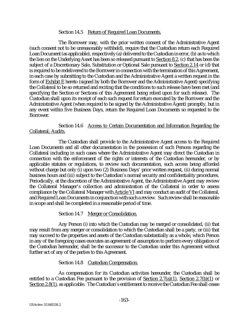 Section 14.5 Return of Required Loan Documents. The Borrower may, with the prior written consent of the Administrative Agent (such consent not to be unreasonably withheld), require that the Custodian return each Required Loan Document (as applicable), respectively (a) delivered to the Custodian in error, (b) as to which the lien on the Underlying Asset has been so released pursuant to Section 8.2, (c) that has been the subject of a Discretionary Sale, Substitution or Optional Sale pursuant to Section 2.14 or (d) that is required to be redelivered to the Borrower in connection with the termination of this Agreement, in each case by submitting to the Custodian and the Administrative Agent a written request in the form of Exhibit E hereto (signed by both the Borrower and the Administrative Agent) specifying the Collateral to be so returned and reciting that the conditions to such release have been met (and specifying the Section or Sections of this Agreement being relied upon for such release). The Custodian shall upon its receipt of each such request for return executed by the Borrower and the Administrative Agent (when required to be signed by the Administrative Agent) promptly, but in any event within five Business Days, return the Required Loan Documents so requested to the Borrower. Section 14.6 Access to Certain Documentation and Information Regarding the Collateral; Audits. The Custodian shall provide to the Administrative Agent access to the Required Loan Documents and all other documentation in the possession of such Persons regarding the Collateral including in such cases where the Administrative Agent may direct the Custodian in connection with the enforcement of the rights or interests of the Custodian hereunder, or by applicable statutes or regulations, to review such documentation, such access being afforded without charge but only (i) upon two (2) Business Days’ prior written request, (ii) during normal business hours and (iii) subject to the Custodian’s normal security and confidentiality procedures. Periodically, at the discretion of the Administrative Agent, the Administrative Agent may review the Collateral Manager’s collection and administration of the Collateral in order to assess compliance by the Collateral Manager with Article VI and may conduct an audit of the Collateral, and Required Loan Documents in conjunction with such a review. Such review shall be reasonable in scope and shall be completed in a reasonable period of time. Section 14.7 Merger or Consolidation. Any Person (i) into which the Custodian may be merged or consolidated, (ii) that may result from any merger or consolidation to which the Custodian shall be a party, or (iii) that may succeed to the properties and assets of the Custodian substantially as a whole, which Person in any of the foregoing cases executes an agreement of assumption to perform every obligation of the Custodian hereunder, shall be the successor to the Custodian under this Agreement without further act of any of the parties to this Agreement. Section 14.8 Custodian Compensation. As compensation for its Custodian activities hereunder, the Custodian shall be entitled to a Custodian Fee pursuant to the provision of Section 2.7(a)(1), Section 2.7(b)(1) or Section 2.8(1), as applicable. The Custodian’s entitlement to receive the Custodian Fee shall cease -163- USActive 55348338.2