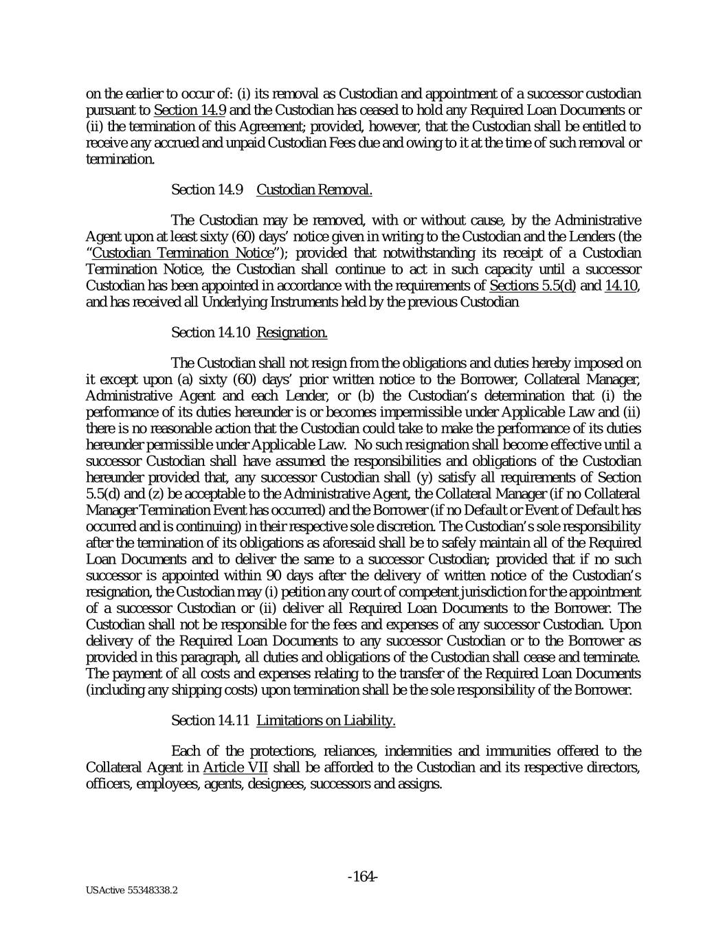on the earlier to occur of: (i) its removal as Custodian and appointment of a successor custodian pursuant to Section 14.9 and the Custodian has ceased to hold any Required Loan Documents or (ii) the termination of this Agreement; provided, however, that the Custodian shall be entitled to receive any accrued and unpaid Custodian Fees due and owing to it at the time of such removal or termination. Section 14.9 Custodian Removal. The Custodian may be removed, with or without cause, by the Administrative Agent upon at least sixty (60) days’ notice given in writing to the Custodian and the Lenders (the “Custodian Termination Notice”); provided that notwithstanding its receipt of a Custodian Termination Notice, the Custodian shall continue to act in such capacity until a successor Custodian has been appointed in accordance with the requirements of Sections 5.5(d) and 14.10, and has received all Underlying Instruments held by the previous Custodian Section 14.10 Resignation. The Custodian shall not resign from the obligations and duties hereby imposed on it except upon (a) sixty (60) days’ prior written notice to the Borrower, Collateral Manager, Administrative Agent and each Lender, or (b) the Custodian’s determination that (i) the performance of its duties hereunder is or becomes impermissible under Applicable Law and (ii) there is no reasonable action that the Custodian could take to make the performance of its duties hereunder permissible under Applicable Law. No such resignation shall become effective until a successor Custodian shall have assumed the responsibilities and obligations of the Custodian hereunder provided that, any successor Custodian shall (y) satisfy all requirements of Section 5.5(d) and (z) be acceptable to the Administrative Agent, the Collateral Manager (if no Collateral Manager Termination Event has occurred) and the Borrower (if no Default or Event of Default has occurred and is continuing) in their respective sole discretion. The Custodian’s sole responsibility after the termination of its obligations as aforesaid shall be to safely maintain all of the Required Loan Documents and to deliver the same to a successor Custodian; provided that if no such successor is appointed within 90 days after the delivery of written notice of the Custodian’s resignation, the Custodian may (i) petition any court of competent jurisdiction for the appointment of a successor Custodian or (ii) deliver all Required Loan Documents to the Borrower. The Custodian shall not be responsible for the fees and expenses of any successor Custodian. Upon delivery of the Required Loan Documents to any successor Custodian or to the Borrower as provided in this paragraph, all duties and obligations of the Custodian shall cease and terminate. The payment of all costs and expenses relating to the transfer of the Required Loan Documents (including any shipping costs) upon termination shall be the sole responsibility of the Borrower. Section 14.11 Limitations on Liability. Each of the protections, reliances, indemnities and immunities offered to the Collateral Agent in Article VII shall be afforded to the Custodian and its respective directors, officers, employees, agents, designees, successors and assigns. -164- USActive 55348338.2