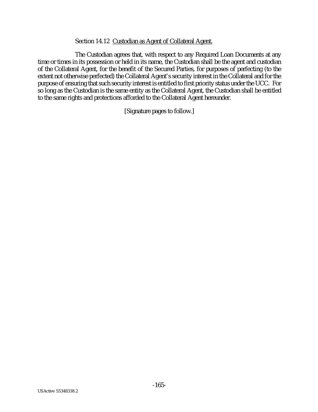 Section 14.12 Custodian as Agent of Collateral Agent. The Custodian agrees that, with respect to any Required Loan Documents at any time or times in its possession or held in its name, the Custodian shall be the agent and custodian of the Collateral Agent, for the benefit of the Secured Parties, for purposes of perfecting (to the extent not otherwise perfected) the Collateral Agent’s security interest in the Collateral and for the purpose of ensuring that such security interest is entitled to first priority status under the UCC. For so long as the Custodian is the same entity as the Collateral Agent, the Custodian shall be entitled to the same rights and protections afforded to the Collateral Agent hereunder. [Signature pages to follow.] -165- USActive 55348338.2