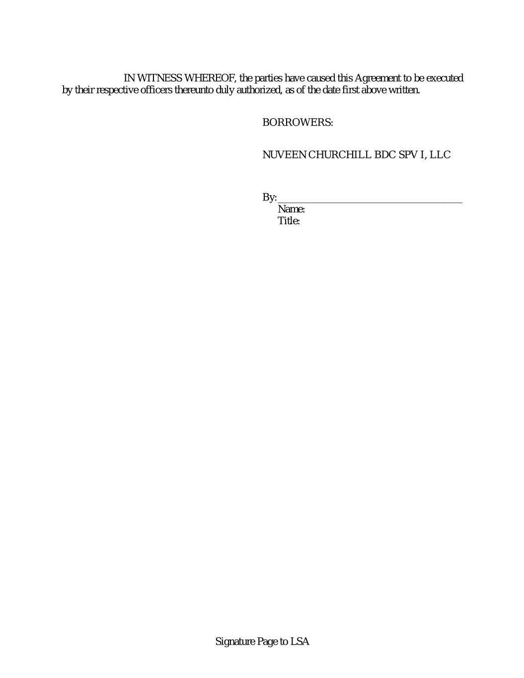 IN WITNESS WHEREOF, the parties have caused this Agreement to be executed by their respective officers thereunto duly authorized, as of the date first above written. BORROWERS: NUVEEN CHURCHILL BDC SPV I, LLC By: ____________________________________ Name: Title: Signature Page to LSA