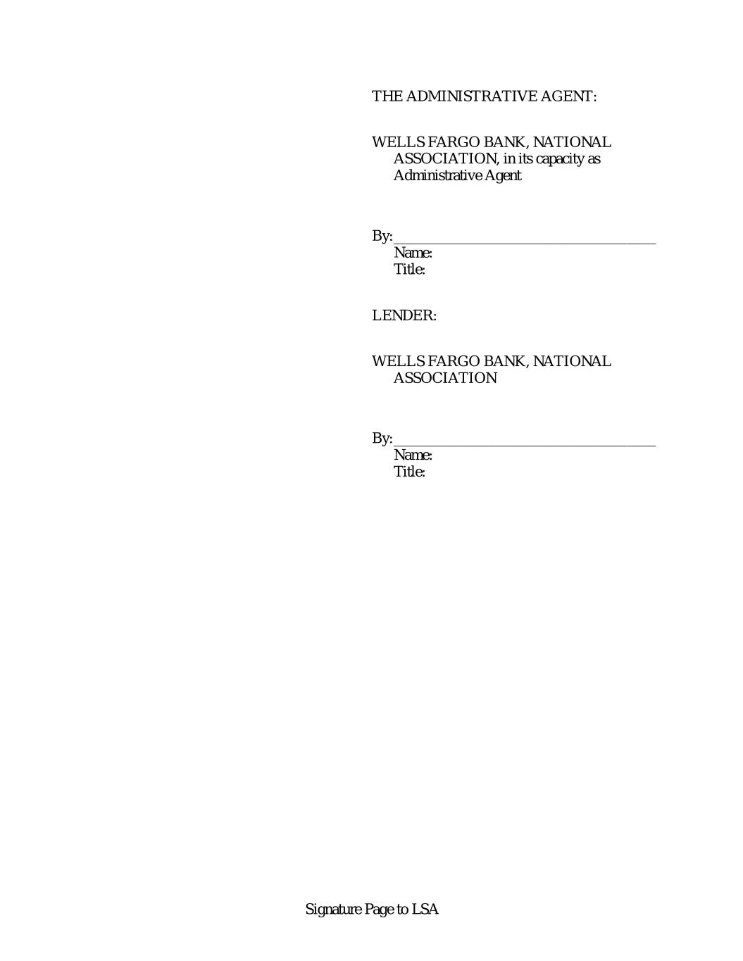 THE ADMINISTRATIVE AGENT: WELLS FARGO BANK, NATIONAL ASSOCIATION, in its capacity as Administrative Agent By: ____________________________________ Name: Title: LENDER: WELLS FARGO BANK, NATIONAL ASSOCIATION By: ____________________________________ Name: Title: Signature Page to LSA