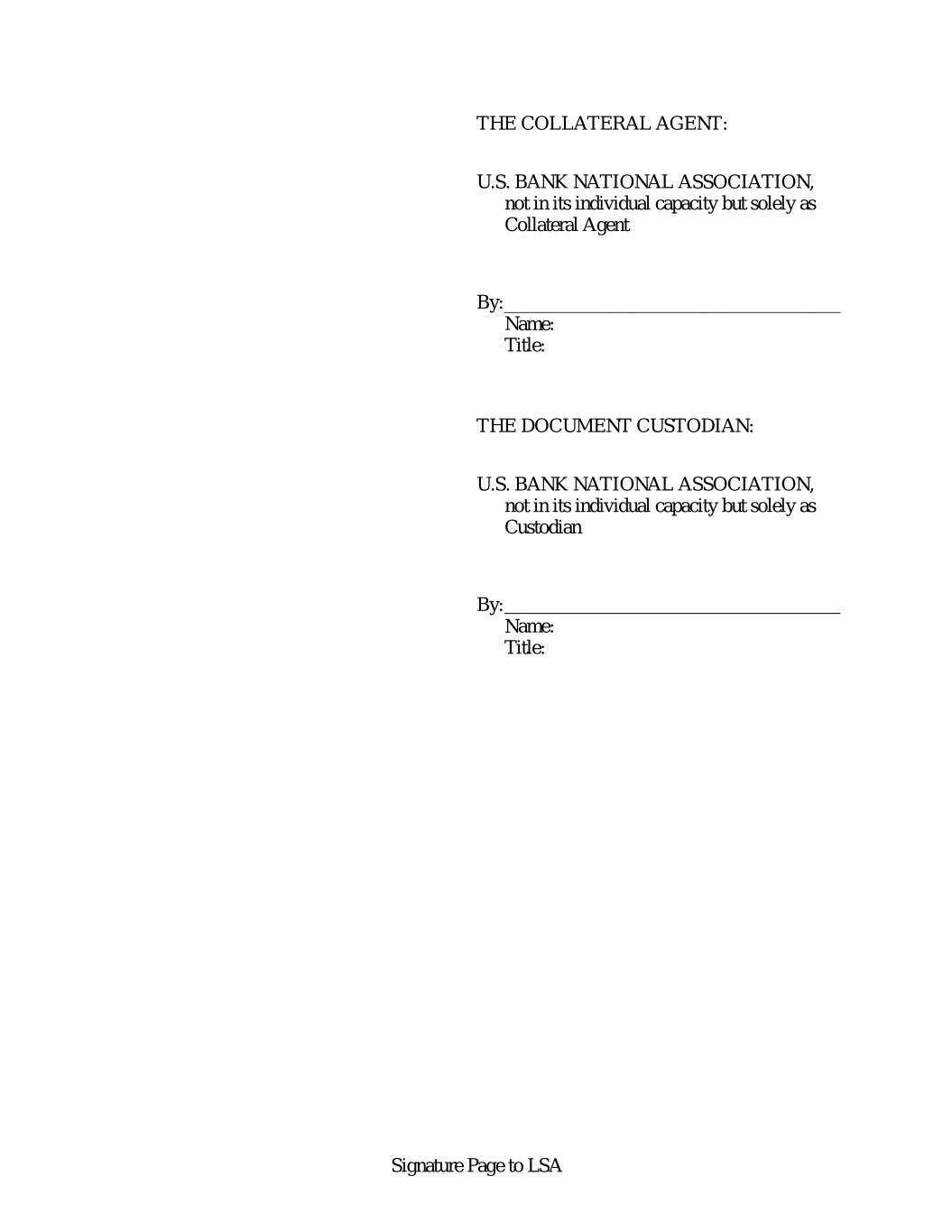 THE COLLATERAL AGENT: U.S. BANK NATIONAL ASSOCIATION, not in its individual capacity but solely as Collateral Agent By: ____________________________________ Name: Title: THE DOCUMENT CUSTODIAN: U.S. BANK NATIONAL ASSOCIATION, not in its individual capacity but solely as Custodian By: Name: Title: Signature Page to LSA
