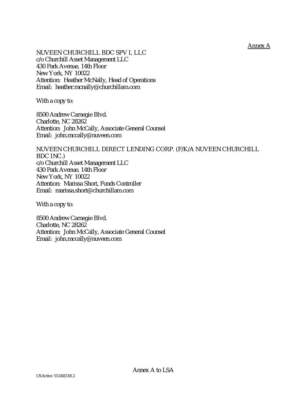Annex A NUVEEN CHURCHILL BDC SPV I, LLC c/o Churchill Asset Management LLC 430 Park Avenue, 14th Floor New York, NY 10022 Attention: Heather McNally, Head of Operations Email: heather.mcnally@churchillam.com With a copy to: 8500 Andrew Carnegie Blvd. Charlotte, NC 28262 Attention: John McCally, Associate General Counsel Email: john.mccally@nuveen.com NUVEEN CHURCHILL DIRECT LENDING CORP. (F/K/A NUVEEN CHURCHILL BDC INC.) c/o Churchill Asset Management LLC 430 Park Avenue, 14th Floor New York, NY 10022 Attention: Marissa Short, Funds Controller Email: marissa.short@churchillam.com With a copy to: 8500 Andrew Carnegie Blvd. Charlotte, NC 28262 Attention: John McCally, Associate General Counsel Email: john.mccally@nuveen.com Annex A to LSA USActive 55348338.2