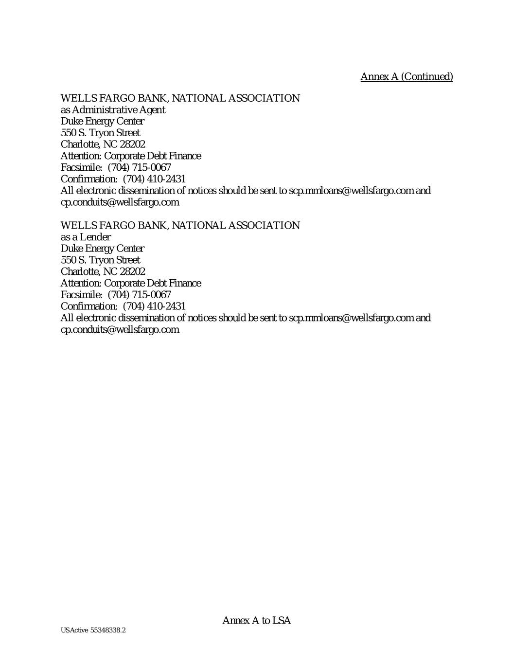 Annex A (Continued) WELLS FARGO BANK, NATIONAL ASSOCIATION as Administrative Agent Duke Energy Center 550 S. Tryon Street Charlotte, NC 28202 Attention: Corporate Debt Finance Facsimile: (704) 715-0067 Confirmation: (704) 410-2431 All electronic dissemination of notices should be sent to scp.mmloans@wellsfargo.com and cp.conduits@wellsfargo.com WELLS FARGO BANK, NATIONAL ASSOCIATION as a Lender Duke Energy Center 550 S. Tryon Street Charlotte, NC 28202 Attention: Corporate Debt Finance Facsimile: (704) 715-0067 Confirmation: (704) 410-2431 All electronic dissemination of notices should be sent to scp.mmloans@wellsfargo.com and cp.conduits@wellsfargo.com Annex A to LSA USActive 55348338.2