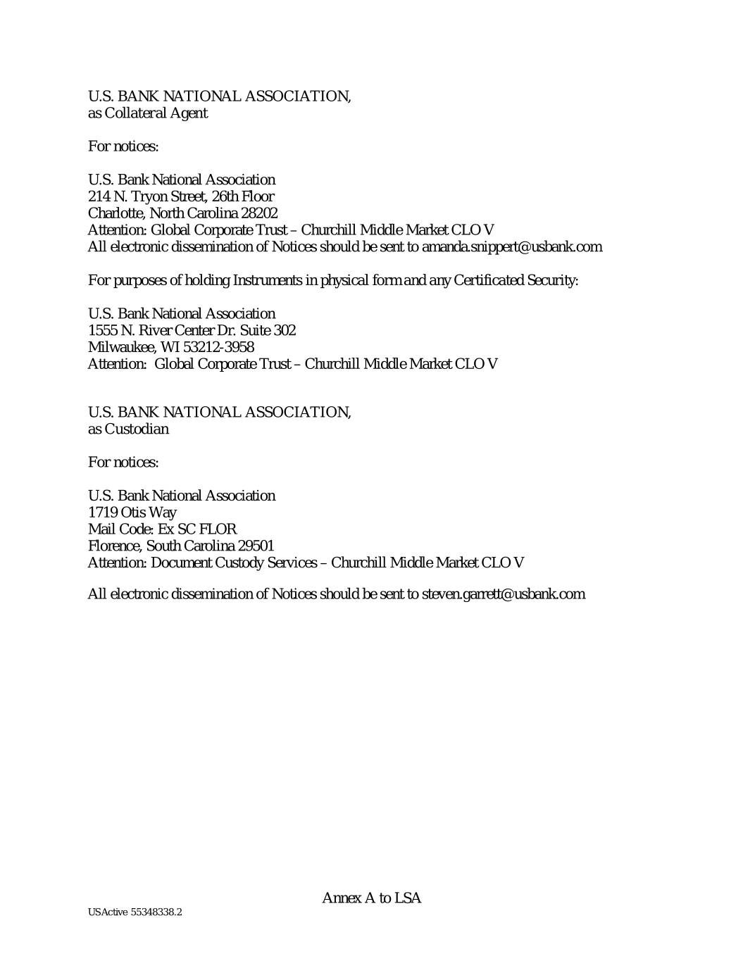 U.S. BANK NATIONAL ASSOCIATION, as Collateral Agent For notices: U.S. Bank National Association 214 N. Tryon Street, 26th Floor Charlotte, North Carolina 28202 Attention: Global Corporate Trust – Churchill Middle Market CLO V All electronic dissemination of Notices should be sent to amanda.snippert@usbank.com For purposes of holding Instruments in physical form and any Certificated Security: U.S. Bank National Association 1555 N. River Center Dr. Suite 302 Milwaukee, WI 53212-3958 Attention: Global Corporate Trust – Churchill Middle Market CLO V U.S. BANK NATIONAL ASSOCIATION, as Custodian For notices: U.S. Bank National Association 1719 Otis Way Mail Code: Ex SC FLOR Florence, South Carolina 29501 Attention: Document Custody Services – Churchill Middle Market CLO V All electronic dissemination of Notices should be sent to steven.garrett@usbank.com Annex A to LSA USActive 55348338.2