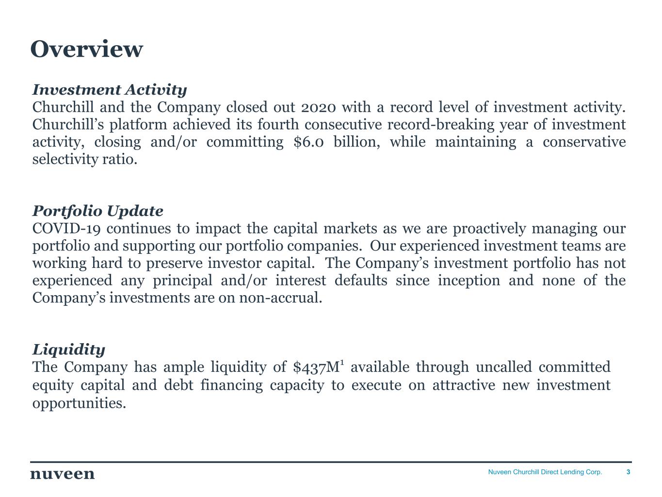 2Nuveen Churchill Direct Lending Corp. Disclaimer This presentation is for informational purposes only. It does not convey an offer of any type and is not intended to be, and should not be construed as, an offer to sell, or the solicitation of an offer to buy, any securities of Nuveen Churchill Direct Lending Corp. (the “Company,” “we,” “us” or “our”). Any such offering can be made only at the time a qualified offeree receives a confidential private placement memorandum and other operative documents which contain significant details with respect to risks and should be carefully read. In addition, the information in this presentation is qualified in its entirety by reference to all of the information in the Company’s confidential private placement memorandum and the Company’s public filings with the Securities and Exchange Commission (the “SEC”), including without limitation, the risk factors. Nothing in this presentation constitutes investment advice. The Company’s securities have not been registered under the Securities Act of 1933 or listed on any securities exchange. You or your clients may lose money by investing in the Company. The Company is not intended to be a complete investment program and, due to the uncertainty inherent in all investments, there can be no assurance that the Company will achieve its investment objectives. The information contained herein is not intended to provide, and should not be relied upon for, accounting, legal or tax advice or investment recommendations. Prospective investors should also seek advice from their own independent tax, accounting, financial, investment and legal advisors to properly assess the merits and risks associated with an investment in the Company in light of their own financial condition and other circumstances. These materials and the presentations of which they are a part, and the summaries contained herein, do not purport to be complete and no obligation to update or otherwise revise such information is being assumed. Nothing shall be relied upon as a promise or representation as to the future performance of the Company. Such information is qualified in its entirety by reference to the more detailed discussions contained elsewhere in the Company’s confidential private placement memorandum and public filings with the SEC. An investment in the Company is speculative and involves a high degree of risk. There can be no guarantee that the Company’s investment objective will be achieved. The Company may engage in other investment practices that may increase the risk of investment loss. An investor could lose all or substantially all of his, her or its investment. The Company may not provide periodic valuation information to investors, and there may be delays in distributing important tax information. The Company’s fees and expenses may be considered high and, as a result, such fees and expenses may offset the Company’s profits. For a summary of certain of these and other risks, please see the Company’s confidential private placement memorandum and public filings with the SEC. There is no guarantee that any of the estimates, targets or projections illustrated in these materials and any presentation of which they form a part will be achieved. Any references herein to any of the Company’s past or present investments or its past or present performance, have been provided for illustrative purposes only. It should not be assumed that these investments were or will be profitable or that any future investments by the Company will be profitable or will equal the performance of these investments. This presentation contains forward-looking statements that involve substantial risks and uncertainties. Such statements involve known and unknown risks, uncertainties and other factors and undue reliance should not be placed thereon. These forward-looking statements are not historical facts, but rather are based on current expectations, estimates and projections about the Company, our current and prospective portfolio investments, our industry, our beliefs and opinions, and our assumptions. Words such as “anticipates,” “expects,” “intends,” “plans,” “will,” “may,” “continue,” “believes,” “seeks,” “estimates,” “would,” “could,” “should,” “targets,” “projects,” “outlook,” “potential,” “predicts” and variations of these words and similar expressions are intended to identify forward- looking statements. These statements are not guarantees of future performance and are subject to risks, uncertainties and other factors that are outlined in the Company’s confidential private placement memorandum and public filings with the SEC, some of which are beyond our control and difficult to predict and could cause actual results to differ materially from those expressed or forecasted in the forward-looking statements. The Company is providing the information as of this date (unless otherwise specified) and assumes no obligations to update or revise any forward- looking statements, whether as a result of new information, future events or otherwise. Additionally, our actual results and financial condition may differ materially as a result of the continued impact of the novel coronavirus (“COVID-19”) pandemic, including without limitation: the length and duration of the COVID-19 outbreak in the United States as well as worldwide and the magnitude of the economic impact of that outbreak; the effect of the COVID-19 pandemic on our business prospects and the prospects of our portfolio companies, including our and their ability to achieve our respective objectives; and the effect of the disruptions caused by the COVID-19 pandemic on our ability to continue to effectively manage our business (including on our ability to source and close new investment opportunities) and on the availability of equity and debt capital and our use of borrowed money to finance a portio