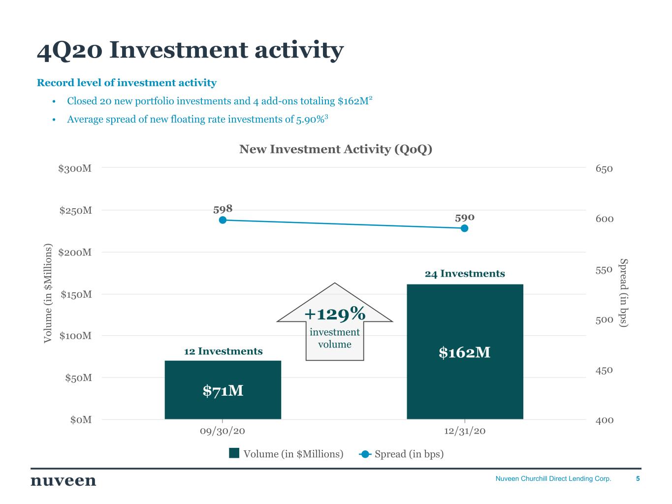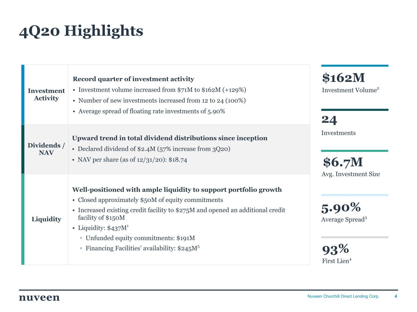 3Nuveen Churchill Direct Lending Corp. Overview Investment Activity Churchill and the Company closed out 2020 with a record level of investment activity. Churchill’s platform achieved its fourth consecutive record-breaking year of investment activity, closing and/or committing $6.0 billion, while maintaining a conservative selectivity ratio. Portfolio Update COVID-19 continues to impact the capital markets as we are proactively managing our portfolio and supporting our portfolio companies. Our experienced investment teams are working hard to preserve investor capital. The Company’s investment portfolio has not experienced any principal and/or interest defaults since inception and none of the Company’s investments are on non-accrual. Liquidity The Company has ample liquidity of $437M1 available through uncalled committed equity capital and debt financing capacity to execute on attractive new investment opportunities.
