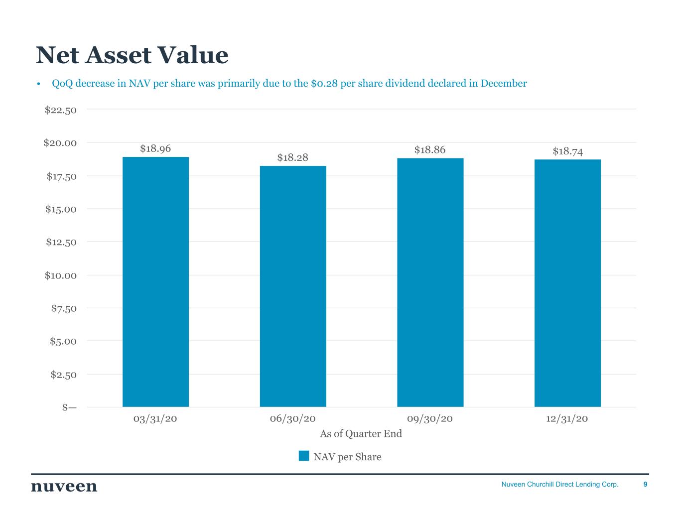 8Nuveen Churchill Direct Lending Corp. Financing Financing Facilities Amount (in $Millions) Drawn (in $Millions) Pricing Maturity SMBC Financing Facility $150.0 $28.5 L + 2.50% (no LIBOR floor) November 24, 2025 Wells Fargo Financing Facility $275.0 $146.1 L + 2.50% (no LIBOR floor) October 28, 2025 SMBC Subscription Facility $30.0 $17.5 L + 1.75% (no LIBOR floor) September 10, 2021 Total $455.0 $192.2 • The Company has a committed Subscription Facility and two Financing Facilities ◦ Investment activity increased utilization in Q4 Three Months Ended A ve ra g e In te re st R at e (% ) Averag e D aily B o rro w in g (in $ T h o u san d s) Financing Activities (QoQ) $102,013 $153,838 2.8% 2.7% Average Daily Borrowing (in $Thousands) Average Interest Rate 09/30/20 12/31/20 0% 1% 2% 3% 4% $— $50,000 $100,000 $150,000 $200,000 $250,000 $300,000
