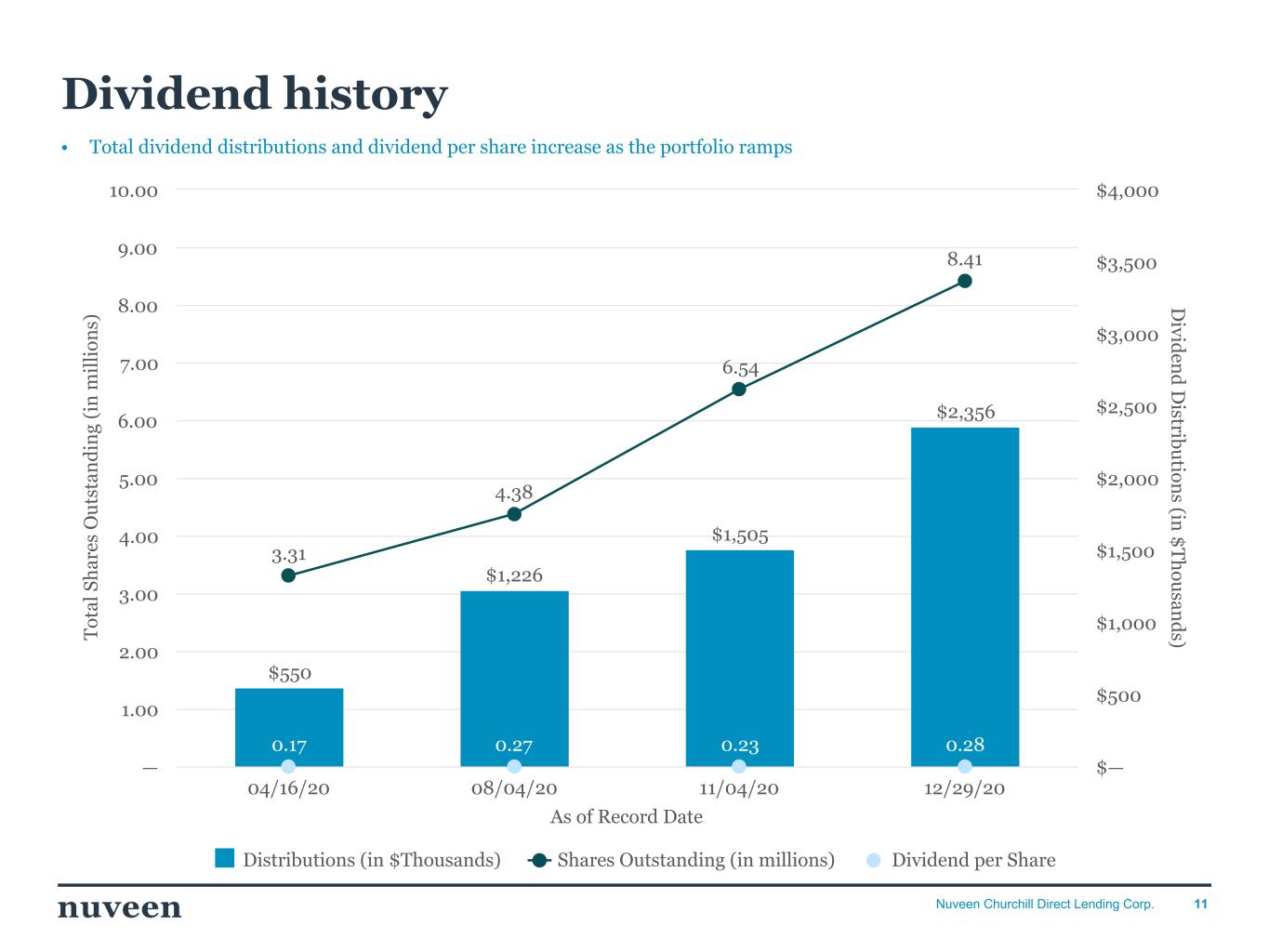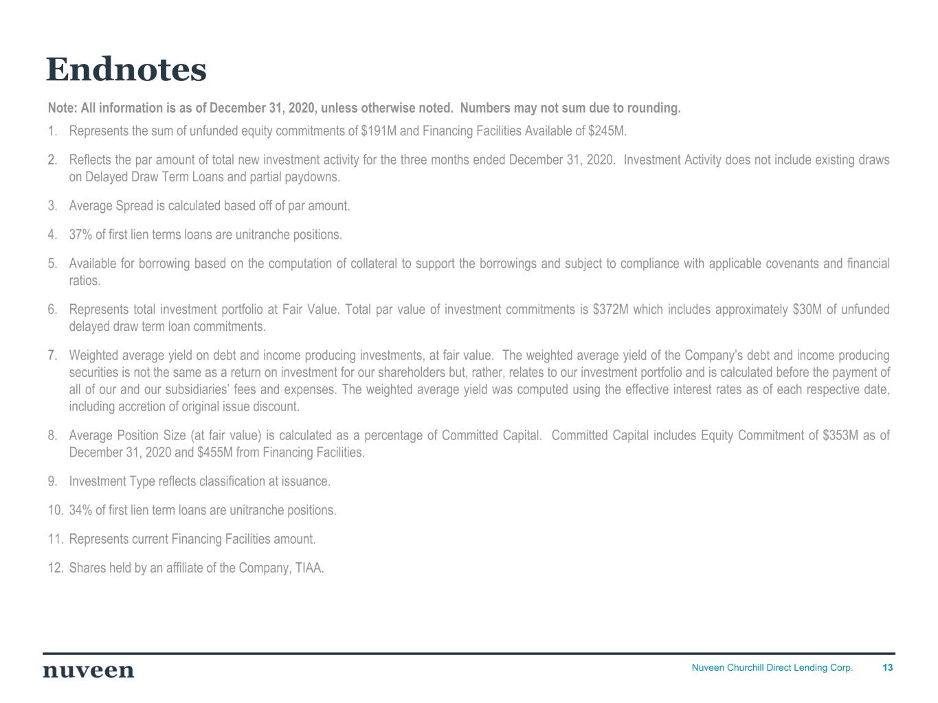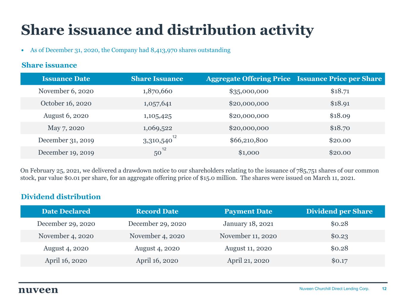 12Nuveen Churchill Direct Lending Corp. Share issuance and distribution activity Issuance Date Share Issuance Aggregate Offering Price Issuance Price per Share November 6, 2020 1,870,660 $35,000,000 $18.71 October 16, 2020 1,057,641 $20,000,000 $18.91 August 6, 2020 1,105,425 $20,000,000 $18.09 May 7, 2020 1,069,522 $20,000,000 $18.70 December 31, 2019 3,310,540 $66,210,800 $20.00 December 19, 2019 50 $1,000 $20.00 Share issuance Date Declared Record Date Payment Date Dividend per Share December 29, 2020 December 29, 2020 January 18, 2021 $0.28 November 4, 2020 November 4, 2020 November 11, 2020 $0.23 August 4, 2020 August 4, 2020 August 11, 2020 $0.28 April 16, 2020 April 16, 2020 April 21, 2020 $0.17 Dividend distribution • As of December 31, 2020, the Company had 8,413,970 shares outstanding On February 25, 2021, we delivered a drawdown notice to our shareholders relating to the issuance of 785,751 shares of our common stock, par value $0.01 per share, for an aggregate offering price of $15.0 million. The shares were issued on March 11, 2021. 12 12