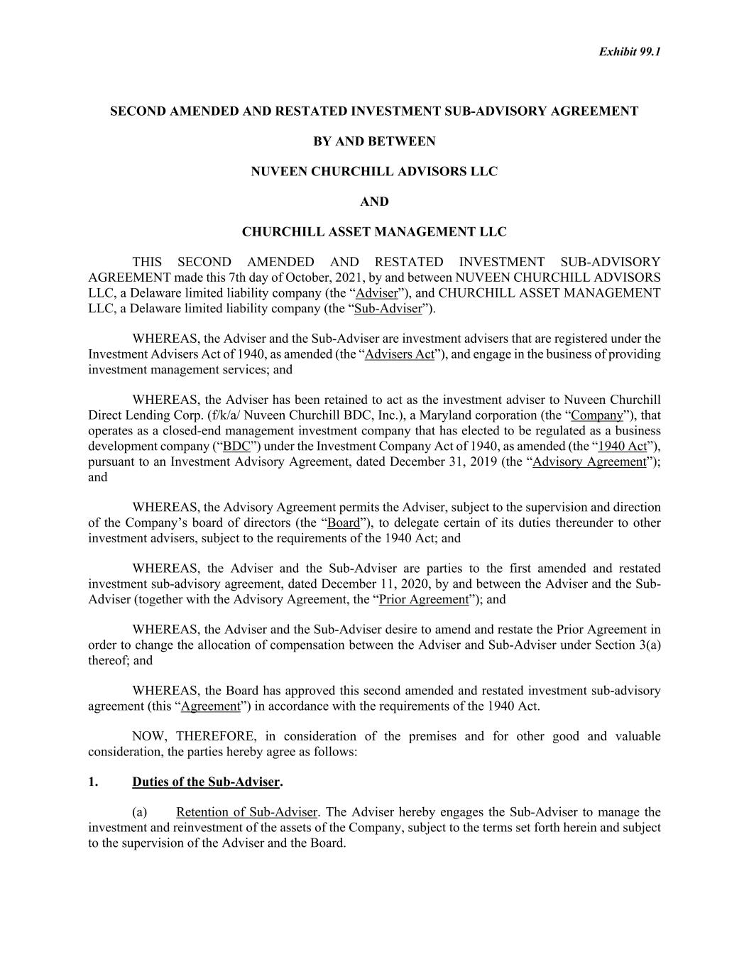 Exhibit 99.1 SECOND AMENDED AND RESTATED INVESTMENT SUB-ADVISORY AGREEMENT BY AND BETWEEN NUVEEN CHURCHILL ADVISORS LLC AND CHURCHILL ASSET MANAGEMENT LLC THIS SECOND AMENDED AND RESTATED INVESTMENT SUB-ADVISORY AGREEMENT made this 7th day of October, 2021, by and between NUVEEN CHURCHILL ADVISORS LLC, a Delaware limited liability company (the “Adviser”), and CHURCHILL ASSET MANAGEMENT LLC, a Delaware limited liability company (the “Sub-Adviser”). WHEREAS, the Adviser and the Sub-Adviser are investment advisers that are registered under the Investment Advisers Act of 1940, as amended (the “Advisers Act”), and engage in the business of providing investment management services; and WHEREAS, the Adviser has been retained to act as the investment adviser to Nuveen Churchill Direct Lending Corp. (f/k/a/ Nuveen Churchill BDC, Inc.), a Maryland corporation (the “Company”), that operates as a closed-end management investment company that has elected to be regulated as a business development company (“BDC”) under the Investment Company Act of 1940, as amended (the “1940 Act”), pursuant to an Investment Advisory Agreement, dated December 31, 2019 (the “Advisory Agreement”); and WHEREAS, the Advisory Agreement permits the Adviser, subject to the supervision and direction of the Company’s board of directors (the “Board”), to delegate certain of its duties thereunder to other investment advisers, subject to the requirements of the 1940 Act; and WHEREAS, the Adviser and the Sub-Adviser are parties to the first amended and restated investment sub-advisory agreement, dated December 11, 2020, by and between the Adviser and the Sub- Adviser (together with the Advisory Agreement, the “Prior Agreement”); and WHEREAS, the Adviser and the Sub-Adviser desire to amend and restate the Prior Agreement in order to change the allocation of compensation between the Adviser and Sub-Adviser under Section 3(a) thereof; and WHEREAS, the Board has approved this second amended and restated investment sub-advisory agreement (this “Agreement”) in accordance with the requirements of the 1940 Act. NOW, THEREFORE, in consideration of the premises and for other good and valuable consideration, the parties hereby agree as follows: 1. Duties of the Sub-Adviser. (a) Retention of Sub-Adviser. The Adviser hereby engages the Sub-Adviser to manage the investment and reinvestment of the assets of the Company, subject to the terms set forth herein and subject to the supervision of the Adviser and the Board.