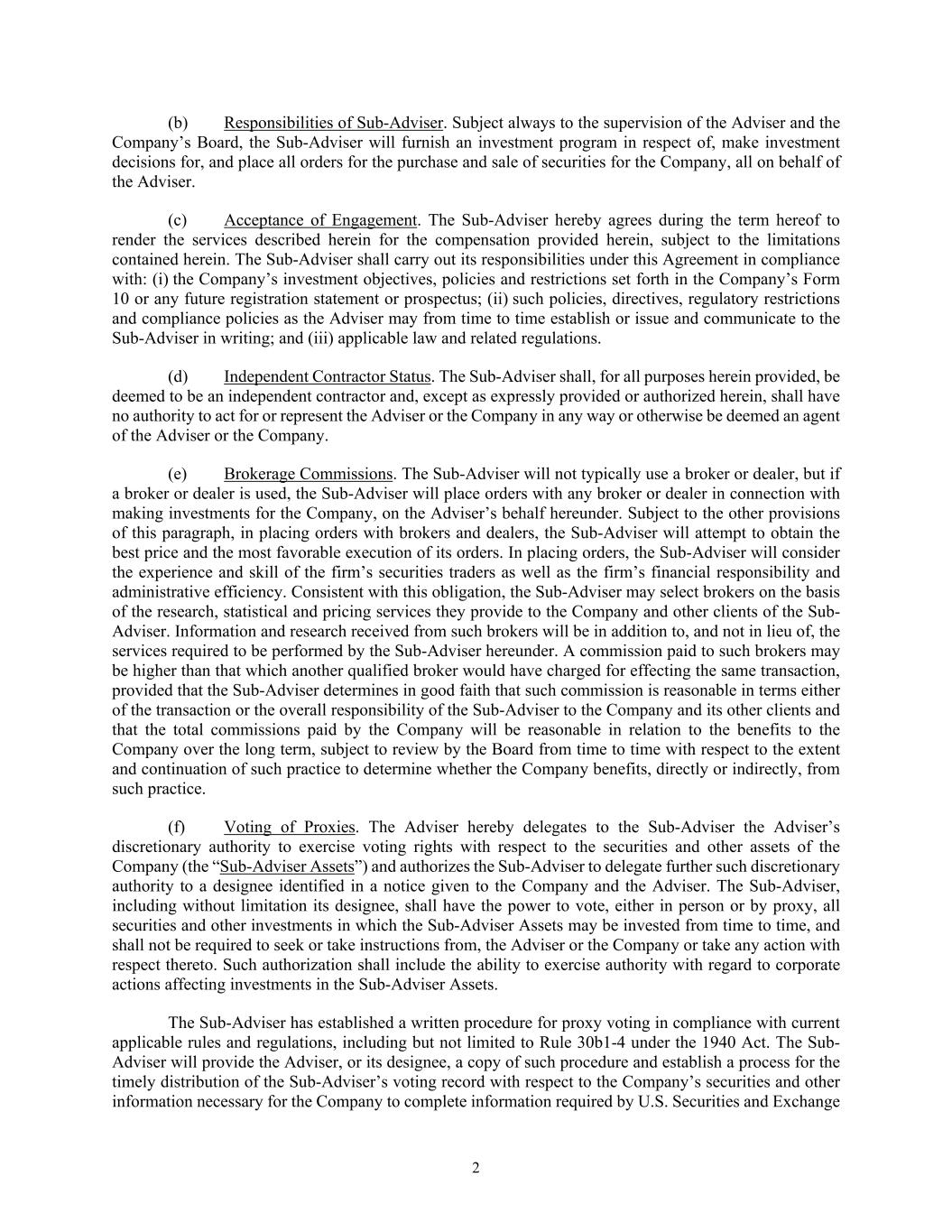 2 (b) Responsibilities of Sub-Adviser. Subject always to the supervision of the Adviser and the Company’s Board, the Sub-Adviser will furnish an investment program in respect of, make investment decisions for, and place all orders for the purchase and sale of securities for the Company, all on behalf of the Adviser. (c) Acceptance of Engagement. The Sub-Adviser hereby agrees during the term hereof to render the services described herein for the compensation provided herein, subject to the limitations contained herein. The Sub-Adviser shall carry out its responsibilities under this Agreement in compliance with: (i) the Company’s investment objectives, policies and restrictions set forth in the Company’s Form 10 or any future registration statement or prospectus; (ii) such policies, directives, regulatory restrictions and compliance policies as the Adviser may from time to time establish or issue and communicate to the Sub-Adviser in writing; and (iii) applicable law and related regulations. (d) Independent Contractor Status. The Sub-Adviser shall, for all purposes herein provided, be deemed to be an independent contractor and, except as expressly provided or authorized herein, shall have no authority to act for or represent the Adviser or the Company in any way or otherwise be deemed an agent of the Adviser or the Company. (e) Brokerage Commissions. The Sub-Adviser will not typically use a broker or dealer, but if a broker or dealer is used, the Sub-Adviser will place orders with any broker or dealer in connection with making investments for the Company, on the Adviser’s behalf hereunder. Subject to the other provisions of this paragraph, in placing orders with brokers and dealers, the Sub-Adviser will attempt to obtain the best price and the most favorable execution of its orders. In placing orders, the Sub-Adviser will consider the experience and skill of the firm’s securities traders as well as the firm’s financial responsibility and administrative efficiency. Consistent with this obligation, the Sub-Adviser may select brokers on the basis of the research, statistical and pricing services they provide to the Company and other clients of the Sub- Adviser. Information and research received from such brokers will be in addition to, and not in lieu of, the services required to be performed by the Sub-Adviser hereunder. A commission paid to such brokers may be higher than that which another qualified broker would have charged for effecting the same transaction, provided that the Sub-Adviser determines in good faith that such commission is reasonable in terms either of the transaction or the overall responsibility of the Sub-Adviser to the Company and its other clients and that the total commissions paid by the Company will be reasonable in relation to the benefits to the Company over the long term, subject to review by the Board from time to time with respect to the extent and continuation of such practice to determine whether the Company benefits, directly or indirectly, from such practice. (f) Voting of Proxies. The Adviser hereby delegates to the Sub-Adviser the Adviser’s discretionary authority to exercise voting rights with respect to the securities and other assets of the Company (the “Sub-Adviser Assets”) and authorizes the Sub-Adviser to delegate further such discretionary authority to a designee identified in a notice given to the Company and the Adviser. The Sub-Adviser, including without limitation its designee, shall have the power to vote, either in person or by proxy, all securities and other investments in which the Sub-Adviser Assets may be invested from time to time, and shall not be required to seek or take instructions from, the Adviser or the Company or take any action with respect thereto. Such authorization shall include the ability to exercise authority with regard to corporate actions affecting investments in the Sub-Adviser Assets. The Sub-Adviser has established a written procedure for proxy voting in compliance with current applicable rules and regulations, including but not limited to Rule 30b1-4 under the 1940 Act. The Sub- Adviser will provide the Adviser, or its designee, a copy of such procedure and establish a process for the timely distribution of the Sub-Adviser’s voting record with respect to the Company’s securities and other information necessary for the Company to complete information required by U.S. Securities and Exchange