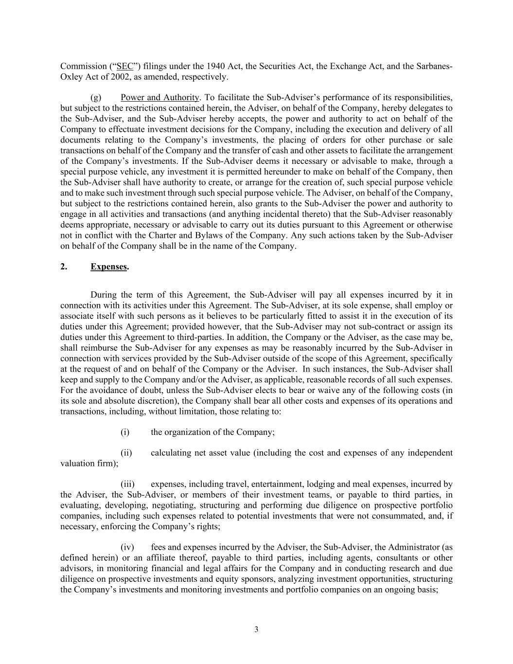 3 Commission (“SEC”) filings under the 1940 Act, the Securities Act, the Exchange Act, and the Sarbanes- Oxley Act of 2002, as amended, respectively. (g) Power and Authority. To facilitate the Sub-Adviser’s performance of its responsibilities, but subject to the restrictions contained herein, the Adviser, on behalf of the Company, hereby delegates to the Sub-Adviser, and the Sub-Adviser hereby accepts, the power and authority to act on behalf of the Company to effectuate investment decisions for the Company, including the execution and delivery of all documents relating to the Company’s investments, the placing of orders for other purchase or sale transactions on behalf of the Company and the transfer of cash and other assets to facilitate the arrangement of the Company’s investments. If the Sub-Adviser deems it necessary or advisable to make, through a special purpose vehicle, any investment it is permitted hereunder to make on behalf of the Company, then the Sub-Adviser shall have authority to create, or arrange for the creation of, such special purpose vehicle and to make such investment through such special purpose vehicle. The Adviser, on behalf of the Company, but subject to the restrictions contained herein, also grants to the Sub-Adviser the power and authority to engage in all activities and transactions (and anything incidental thereto) that the Sub-Adviser reasonably deems appropriate, necessary or advisable to carry out its duties pursuant to this Agreement or otherwise not in conflict with the Charter and Bylaws of the Company. Any such actions taken by the Sub-Adviser on behalf of the Company shall be in the name of the Company. 2. Expenses. During the term of this Agreement, the Sub-Adviser will pay all expenses incurred by it in connection with its activities under this Agreement. The Sub-Adviser, at its sole expense, shall employ or associate itself with such persons as it believes to be particularly fitted to assist it in the execution of its duties under this Agreement; provided however, that the Sub-Adviser may not sub-contract or assign its duties under this Agreement to third-parties. In addition, the Company or the Adviser, as the case may be, shall reimburse the Sub-Adviser for any expenses as may be reasonably incurred by the Sub-Adviser in connection with services provided by the Sub-Adviser outside of the scope of this Agreement, specifically at the request of and on behalf of the Company or the Adviser. In such instances, the Sub-Adviser shall keep and supply to the Company and/or the Adviser, as applicable, reasonable records of all such expenses. For the avoidance of doubt, unless the Sub-Adviser elects to bear or waive any of the following costs (in its sole and absolute discretion), the Company shall bear all other costs and expenses of its operations and transactions, including, without limitation, those relating to: (i) the organization of the Company; (ii) calculating net asset value (including the cost and expenses of any independent valuation firm); (iii) expenses, including travel, entertainment, lodging and meal expenses, incurred by the Adviser, the Sub-Adviser, or members of their investment teams, or payable to third parties, in evaluating, developing, negotiating, structuring and performing due diligence on prospective portfolio companies, including such expenses related to potential investments that were not consummated, and, if necessary, enforcing the Company’s rights; (iv) fees and expenses incurred by the Adviser, the Sub-Adviser, the Administrator (as defined herein) or an affiliate thereof, payable to third parties, including agents, consultants or other advisors, in monitoring financial and legal affairs for the Company and in conducting research and due diligence on prospective investments and equity sponsors, analyzing investment opportunities, structuring the Company’s investments and monitoring investments and portfolio companies on an ongoing basis;