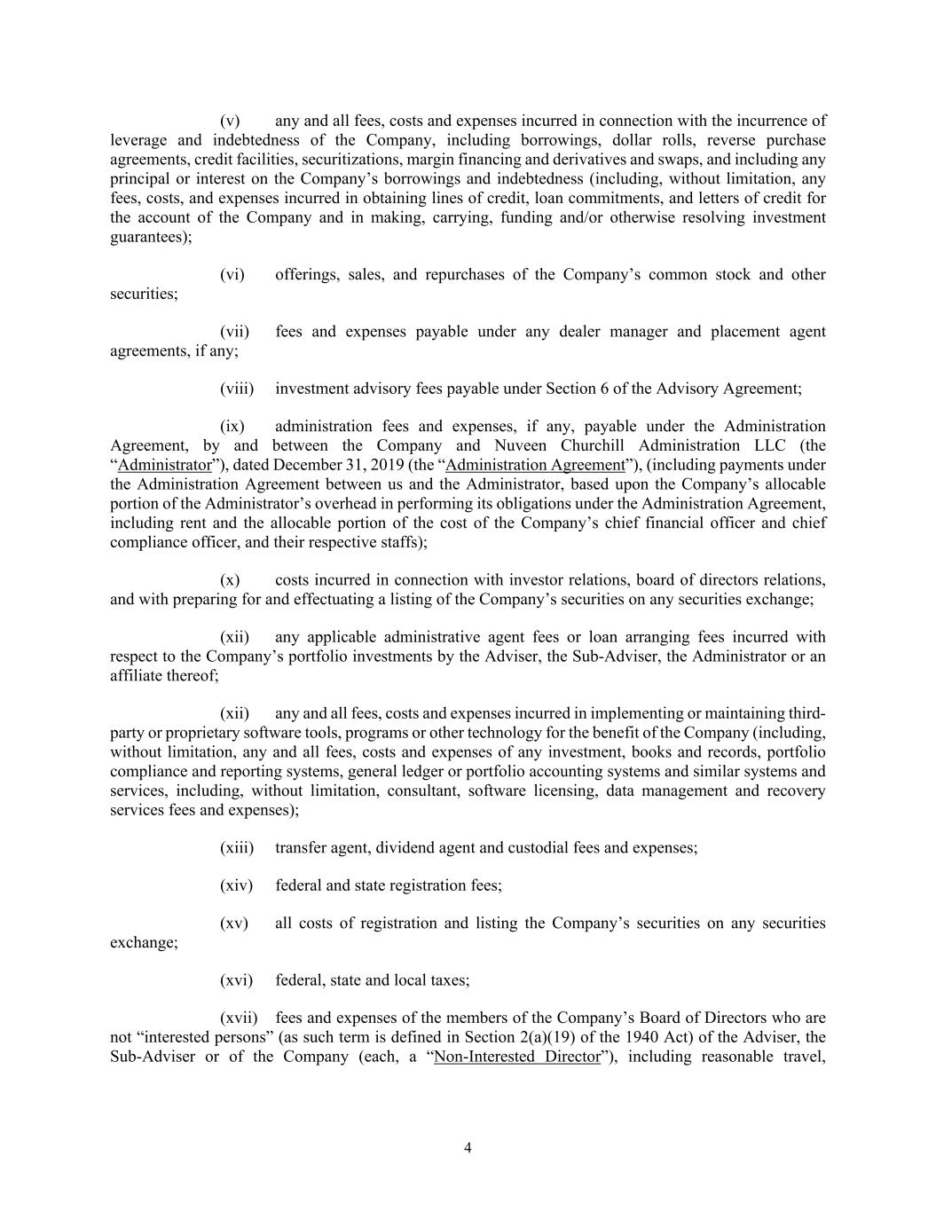 4 (v) any and all fees, costs and expenses incurred in connection with the incurrence of leverage and indebtedness of the Company, including borrowings, dollar rolls, reverse purchase agreements, credit facilities, securitizations, margin financing and derivatives and swaps, and including any principal or interest on the Company’s borrowings and indebtedness (including, without limitation, any fees, costs, and expenses incurred in obtaining lines of credit, loan commitments, and letters of credit for the account of the Company and in making, carrying, funding and/or otherwise resolving investment guarantees); (vi) offerings, sales, and repurchases of the Company’s common stock and other securities; (vii) fees and expenses payable under any dealer manager and placement agent agreements, if any; (viii) investment advisory fees payable under Section 6 of the Advisory Agreement; (ix) administration fees and expenses, if any, payable under the Administration Agreement, by and between the Company and Nuveen Churchill Administration LLC (the “Administrator”), dated December 31, 2019 (the “Administration Agreement”), (including payments under the Administration Agreement between us and the Administrator, based upon the Company’s allocable portion of the Administrator’s overhead in performing its obligations under the Administration Agreement, including rent and the allocable portion of the cost of the Company’s chief financial officer and chief compliance officer, and their respective staffs); (x) costs incurred in connection with investor relations, board of directors relations, and with preparing for and effectuating a listing of the Company’s securities on any securities exchange; (xii) any applicable administrative agent fees or loan arranging fees incurred with respect to the Company’s portfolio investments by the Adviser, the Sub-Adviser, the Administrator or an affiliate thereof; (xii) any and all fees, costs and expenses incurred in implementing or maintaining third- party or proprietary software tools, programs or other technology for the benefit of the Company (including, without limitation, any and all fees, costs and expenses of any investment, books and records, portfolio compliance and reporting systems, general ledger or portfolio accounting systems and similar systems and services, including, without limitation, consultant, software licensing, data management and recovery services fees and expenses); (xiii) transfer agent, dividend agent and custodial fees and expenses; (xiv) federal and state registration fees; (xv) all costs of registration and listing the Company’s securities on any securities exchange; (xvi) federal, state and local taxes; (xvii) fees and expenses of the members of the Company’s Board of Directors who are not “interested persons” (as such term is defined in Section 2(a)(19) of the 1940 Act) of the Adviser, the Sub-Adviser or of the Company (each, a “Non-Interested Director”), including reasonable travel,