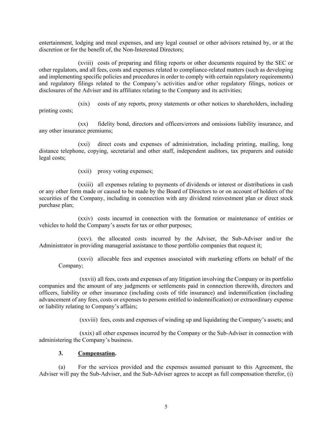 5 entertainment, lodging and meal expenses, and any legal counsel or other advisors retained by, or at the discretion or for the benefit of, the Non-Interested Directors; (xviii) costs of preparing and filing reports or other documents required by the SEC or other regulators, and all fees, costs and expenses related to compliance-related matters (such as developing and implementing specific policies and procedures in order to comply with certain regulatory requirements) and regulatory filings related to the Company’s activities and/or other regulatory filings, notices or disclosures of the Adviser and its affiliates relating to the Company and its activities; (xix) costs of any reports, proxy statements or other notices to shareholders, including printing costs; (xx) fidelity bond, directors and officers/errors and omissions liability insurance, and any other insurance premiums; (xxi) direct costs and expenses of administration, including printing, mailing, long distance telephone, copying, secretarial and other staff, independent auditors, tax preparers and outside legal costs; (xxii) proxy voting expenses; (xxiii) all expenses relating to payments of dividends or interest or distributions in cash or any other form made or caused to be made by the Board of Directors to or on account of holders of the securities of the Company, including in connection with any dividend reinvestment plan or direct stock purchase plan; (xxiv) costs incurred in connection with the formation or maintenance of entities or vehicles to hold the Company’s assets for tax or other purposes; (xxv). the allocated costs incurred by the Adviser, the Sub-Adviser and/or the Administrator in providing managerial assistance to those portfolio companies that request it; (xxvi) allocable fees and expenses associated with marketing efforts on behalf of the Company; (xxvii) all fees, costs and expenses of any litigation involving the Company or its portfolio companies and the amount of any judgments or settlements paid in connection therewith, directors and officers, liability or other insurance (including costs of title insurance) and indemnification (including advancement of any fees, costs or expenses to persons entitled to indemnification) or extraordinary expense or liability relating to Company’s affairs; (xxviii) fees, costs and expenses of winding up and liquidating the Company’s assets; and (xxix) all other expenses incurred by the Company or the Sub-Adviser in connection with administering the Company’s business. 3. Compensation. (a) For the services provided and the expenses assumed pursuant to this Agreement, the Adviser will pay the Sub-Adviser, and the Sub-Adviser agrees to accept as full compensation therefor, (i)