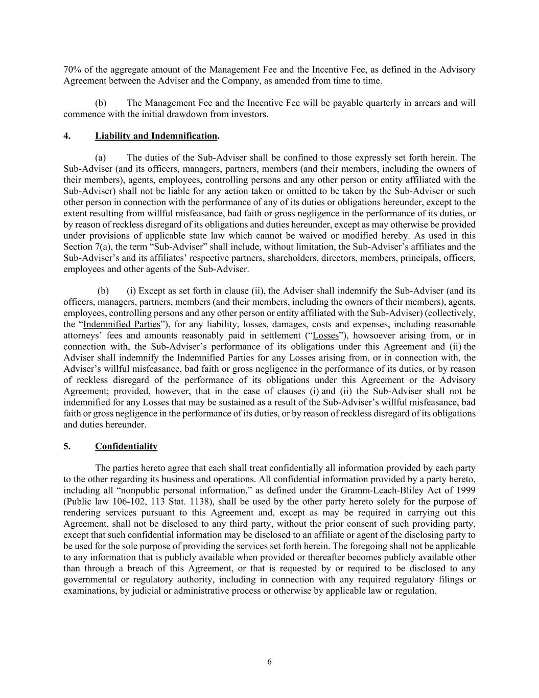6 70% of the aggregate amount of the Management Fee and the Incentive Fee, as defined in the Advisory Agreement between the Adviser and the Company, as amended from time to time. (b) The Management Fee and the Incentive Fee will be payable quarterly in arrears and will commence with the initial drawdown from investors. 4. Liability and Indemnification. (a) The duties of the Sub-Adviser shall be confined to those expressly set forth herein. The Sub-Adviser (and its officers, managers, partners, members (and their members, including the owners of their members), agents, employees, controlling persons and any other person or entity affiliated with the Sub-Adviser) shall not be liable for any action taken or omitted to be taken by the Sub-Adviser or such other person in connection with the performance of any of its duties or obligations hereunder, except to the extent resulting from willful misfeasance, bad faith or gross negligence in the performance of its duties, or by reason of reckless disregard of its obligations and duties hereunder, except as may otherwise be provided under provisions of applicable state law which cannot be waived or modified hereby. As used in this Section 7(a), the term “Sub-Adviser” shall include, without limitation, the Sub-Adviser’s affiliates and the Sub-Adviser’s and its affiliates’ respective partners, shareholders, directors, members, principals, officers, employees and other agents of the Sub-Adviser. (b) (i) Except as set forth in clause (ii), the Adviser shall indemnify the Sub-Adviser (and its officers, managers, partners, members (and their members, including the owners of their members), agents, employees, controlling persons and any other person or entity affiliated with the Sub-Adviser) (collectively, the “Indemnified Parties”), for any liability, losses, damages, costs and expenses, including reasonable attorneys’ fees and amounts reasonably paid in settlement (“Losses”), howsoever arising from, or in connection with, the Sub-Adviser’s performance of its obligations under this Agreement and (ii) the Adviser shall indemnify the Indemnified Parties for any Losses arising from, or in connection with, the Adviser’s willful misfeasance, bad faith or gross negligence in the performance of its duties, or by reason of reckless disregard of the performance of its obligations under this Agreement or the Advisory Agreement; provided, however, that in the case of clauses (i) and (ii) the Sub-Adviser shall not be indemnified for any Losses that may be sustained as a result of the Sub-Adviser’s willful misfeasance, bad faith or gross negligence in the performance of its duties, or by reason of reckless disregard of its obligations and duties hereunder. 5. Confidentiality The parties hereto agree that each shall treat confidentially all information provided by each party to the other regarding its business and operations. All confidential information provided by a party hereto, including all “nonpublic personal information,” as defined under the Gramm-Leach-Bliley Act of 1999 (Public law 106-102, 113 Stat. 1138), shall be used by the other party hereto solely for the purpose of rendering services pursuant to this Agreement and, except as may be required in carrying out this Agreement, shall not be disclosed to any third party, without the prior consent of such providing party, except that such confidential information may be disclosed to an affiliate or agent of the disclosing party to be used for the sole purpose of providing the services set forth herein. The foregoing shall not be applicable to any information that is publicly available when provided or thereafter becomes publicly available other than through a breach of this Agreement, or that is requested by or required to be disclosed to any governmental or regulatory authority, including in connection with any required regulatory filings or examinations, by judicial or administrative process or otherwise by applicable law or regulation.