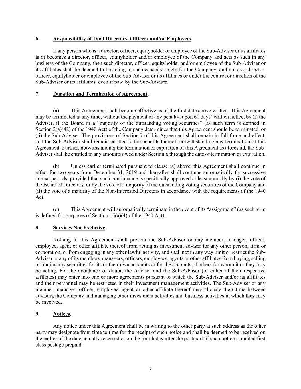 7 6. Responsibility of Dual Directors, Officers and/or Employees If any person who is a director, officer, equityholder or employee of the Sub-Adviser or its affiliates is or becomes a director, officer, equityholder and/or employee of the Company and acts as such in any business of the Company, then such director, officer, equityholder and/or employee of the Sub-Adviser or its affiliates shall be deemed to be acting in such capacity solely for the Company, and not as a director, officer, equityholder or employee of the Sub-Adviser or its affiliates or under the control or direction of the Sub-Adviser or its affiliates, even if paid by the Sub-Adviser. 7. Duration and Termination of Agreement. (a) This Agreement shall become effective as of the first date above written. This Agreement may be terminated at any time, without the payment of any penalty, upon 60 days’ written notice, by (i) the Adviser, if the Board or a “majority of the outstanding voting securities” (as such term is defined in Section 2(a)(42) of the 1940 Act) of the Company determines that this Agreement should be terminated, or (ii) the Sub-Adviser. The provisions of Section 7 of this Agreement shall remain in full force and effect, and the Sub-Adviser shall remain entitled to the benefits thereof, notwithstanding any termination of this Agreement. Further, notwithstanding the termination or expiration of this Agreement as aforesaid, the Sub- Adviser shall be entitled to any amounts owed under Section 6 through the date of termination or expiration. (b) Unless earlier terminated pursuant to clause (a) above, this Agreement shall continue in effect for two years from December 31, 2019 and thereafter shall continue automatically for successive annual periods, provided that such continuance is specifically approved at least annually by (i) the vote of the Board of Directors, or by the vote of a majority of the outstanding voting securities of the Company and (ii) the vote of a majority of the Non-Interested Directors in accordance with the requirements of the 1940 Act. (c) This Agreement will automatically terminate in the event of its “assignment” (as such term is defined for purposes of Section 15(a)(4) of the 1940 Act). 8. Services Not Exclusive. Nothing in this Agreement shall prevent the Sub-Adviser or any member, manager, officer, employee, agent or other affiliate thereof from acting as investment adviser for any other person, firm or corporation, or from engaging in any other lawful activity, and shall not in any way limit or restrict the Sub- Adviser or any of its members, managers, officers, employees, agents or other affiliates from buying, selling or trading any securities for its or their own accounts or for the accounts of others for whom it or they may be acting. For the avoidance of doubt, the Adviser and the Sub-Adviser (or either of their respective affiliates) may enter into one or more agreements pursuant to which the Sub-Adviser and/or its affiliates and their personnel may be restricted in their investment management activities. The Sub-Adviser or any member, manager, officer, employee, agent or other affiliate thereof may allocate their time between advising the Company and managing other investment activities and business activities in which they may be involved. 9. Notices. Any notice under this Agreement shall be in writing to the other party at such address as the other party may designate from time to time for the receipt of such notice and shall be deemed to be received on the earlier of the date actually received or on the fourth day after the postmark if such notice is mailed first class postage prepaid.