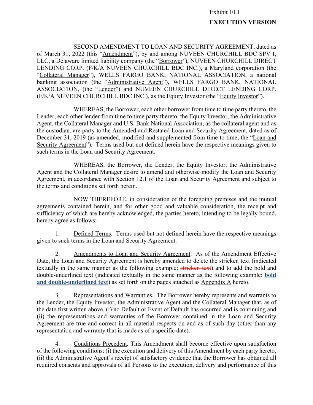 EXECUTION VERSION SECOND AMENDMENT TO LOAN AND SECURITY AGREEMENT, dated as of March 31, 2022 (this “Amendment”), by and among NUVEEN CHURCHILL BDC SPV I, LLC, a Delaware limited liability company (the “Borrower”), NUVEEN CHURCHILL DIRECT LENDING CORP. (F/K/A NUVEEN CHURCHILL BDC INC.), a Maryland corporation (the “Collateral Manager”), WELLS FARGO BANK, NATIONAL ASSOCIATION, a national banking association (the “Administrative Agent”), WELLS FARGO BANK, NATIONAL ASSOCIATION, (the “Lender”) and NUVEEN CHURCHILL DIRECT LENDING CORP. (F/K/A NUVEEN CHURCHILL BDC INC.), as the Equity Investor (the “Equity Investor”). WHEREAS, the Borrower, each other borrower from time to time party thereto, the Lender, each other lender from time to time party thereto, the Equity Investor, the Administrative Agent, the Collateral Manager and U.S. Bank National Association, as the collateral agent and as the custodian, are party to the Amended and Restated Loan and Security Agreement, dated as of December 31, 2019 (as amended, modified and supplemented from time to time, the “Loan and Security Agreement”). Terms used but not defined herein have the respective meanings given to such terms in the Loan and Security Agreement. WHEREAS, the Borrower, the Lender, the Equity Investor, the Administrative Agent and the Collateral Manager desire to amend and otherwise modify the Loan and Security Agreement, in accordance with Section 12.1 of the Loan and Security Agreement and subject to the terms and conditions set forth herein. NOW THEREFORE, in consideration of the foregoing premises and the mutual agreements contained herein, and for other good and valuable consideration, the receipt and sufficiency of which are hereby acknowledged, the parties hereto, intending to be legally bound, hereby agree as follows: Defined Terms. Terms used but not defined herein have the respective meanings given to such terms in the Loan and Security Agreement. Amendments to Loan and Security Agreement. As of the Amendment Effective Date, the Loan and Security Agreement is hereby amended to delete the stricken text (indicated textually in the same manner as the following example: stricken text) and to add the bold and double-underlined text (indicated textually in the same manner as the following example: bold and double-underlined text) as set forth on the pages attached as Appendix A hereto. Representations and Warranties. The Borrower hereby represents and warrants to the Lender, the Equity Investor, the Administrative Agent and the Collateral Manager that, as of the date first written above, (i) no Default or Event of Default has occurred and is continuing and (ii) the representations and warranties of the Borrower contained in the Loan and Security Agreement are true and correct in all material respects on and as of such day (other than any representation and warranty that is made as of a specific date). Conditions Precedent. This Amendment shall become effective upon satisfaction of the following conditions: (i) the execution and delivery of this Amendment by each party hereto, (ii) the Administrative Agent’s receipt of satisfactory evidence that the Borrower has obtained all required consents and approvals of all Persons to the execution, delivery and performance of this Exhibit 10.1
