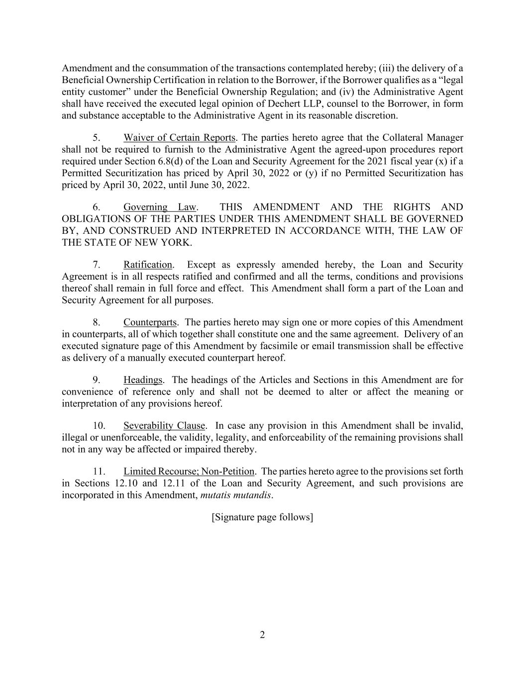 2 Amendment and the consummation of the transactions contemplated hereby; (iii) the delivery of a Beneficial Ownership Certification in relation to the Borrower, if the Borrower qualifies as a “legal entity customer” under the Beneficial Ownership Regulation; and (iv) the Administrative Agent shall have received the executed legal opinion of Dechert LLP, counsel to the Borrower, in form and substance acceptable to the Administrative Agent in its reasonable discretion. Waiver of Certain Reports. The parties hereto agree that the Collateral Manager shall not be required to furnish to the Administrative Agent the agreed-upon procedures report required under Section 6.8(d) of the Loan and Security Agreement for the 2021 fiscal year (x) if a Permitted Securitization has priced by April 30, 2022 or (y) if no Permitted Securitization has priced by April 30, 2022, until June 30, 2022. Governing Law. THIS AMENDMENT AND THE RIGHTS AND OBLIGATIONS OF THE PARTIES UNDER THIS AMENDMENT SHALL BE GOVERNED BY, AND CONSTRUED AND INTERPRETED IN ACCORDANCE WITH, THE LAW OF THE STATE OF NEW YORK. Ratification. Except as expressly amended hereby, the Loan and Security Agreement is in all respects ratified and confirmed and all the terms, conditions and provisions thereof shall remain in full force and effect. This Amendment shall form a part of the Loan and Security Agreement for all purposes. Counterparts. The parties hereto may sign one or more copies of this Amendment in counterparts, all of which together shall constitute one and the same agreement. Delivery of an executed signature page of this Amendment by facsimile or email transmission shall be effective as delivery of a manually executed counterpart hereof. Headings. The headings of the Articles and Sections in this Amendment are for convenience of reference only and shall not be deemed to alter or affect the meaning or interpretation of any provisions hereof. Severability Clause. In case any provision in this Amendment shall be invalid, illegal or unenforceable, the validity, legality, and enforceability of the remaining provisions shall not in any way be affected or impaired thereby. Limited Recourse; Non-Petition. The parties hereto agree to the provisions set forth in Sections 12.10 and 12.11 of the Loan and Security Agreement, and such provisions are incorporated in this Amendment, mutatis mutandis. [Signature page follows]