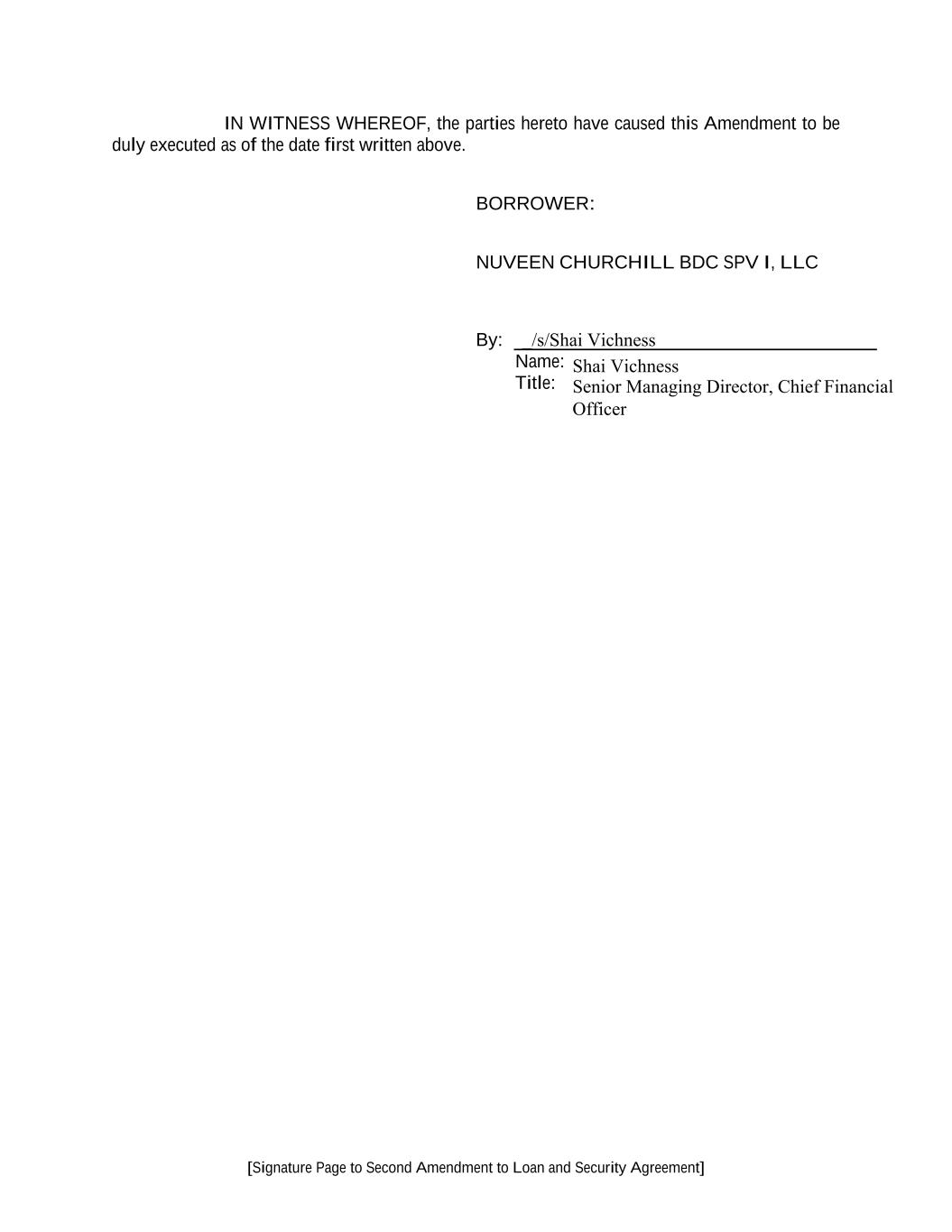 [Signature Page to Second Amendment to Loan and Security Agreement] IN WITNESS WHEREOF, the parties hereto have caused this Amendment to be duly executed as of the date first written above. BORROWER: NUVEEN CHURCHILL BDC SPV I, LLC By: _/s/Shai Vichness _________________________________ Name: Title: Shai Vichness Senior Managing Director, Chief Financial Officer