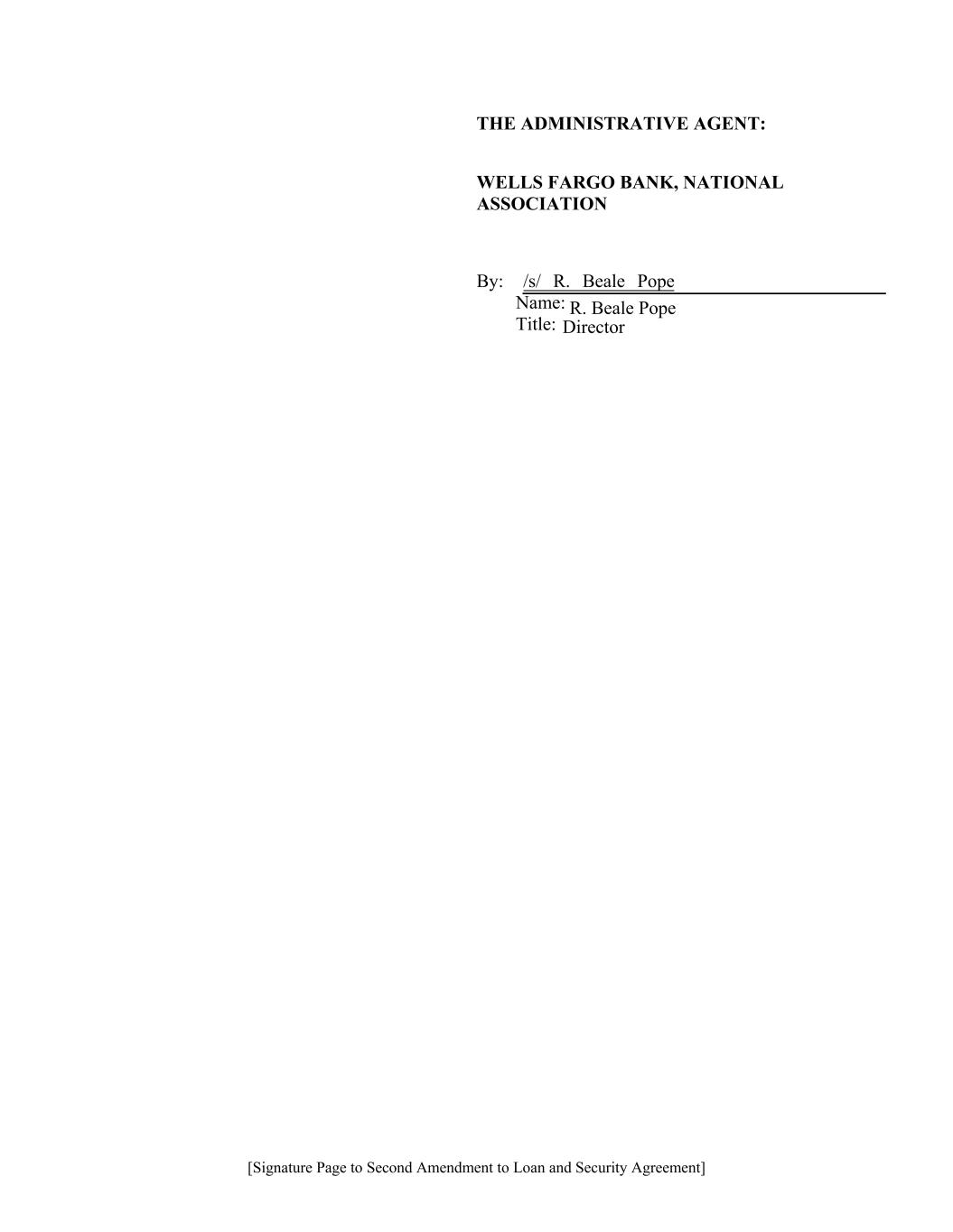 [Signature Page to Second Amendment to Loan and Security Agreement] THE ADMINISTRATIVE AGENT: WELLS FARGO BANK, NATIONAL ASSOCIATION By: /s/ R. Beale Pope _____________________________ Name: Title: R. Beale Pope Director
