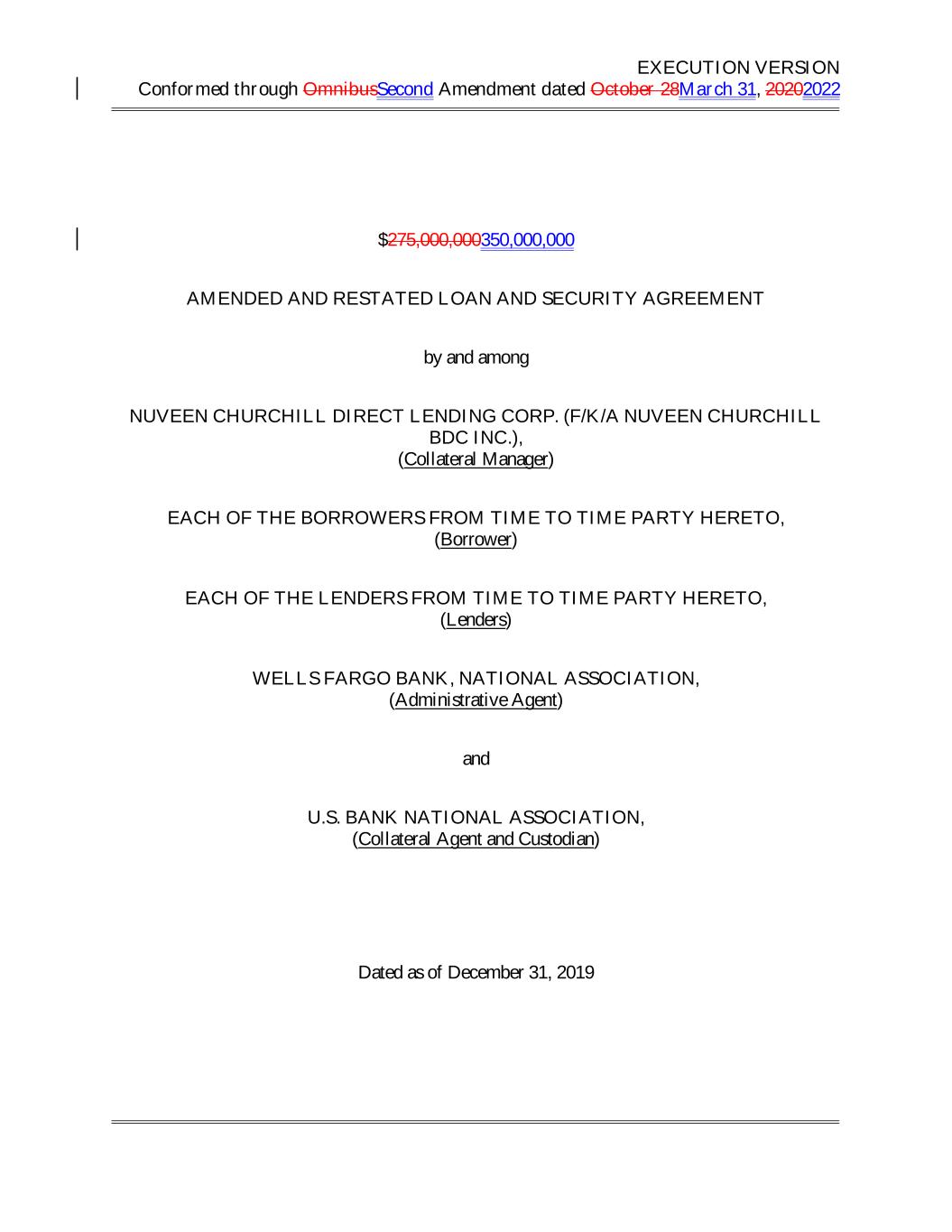 EXECUTION VERSION Conformed through OmnibusSecond Amendment dated October 28March 31, 20202022 $275,000,000350,000,000 AMENDED AND RESTATED LOAN AND SECURITY AGREEMENT by and among NUVEEN CHURCHILL DIRECT LENDING CORP. (F/K/A NUVEEN CHURCHILL BDC INC.), (Collateral Manager) EACH OF THE BORROWERS FROM TIME TO TIME PARTY HERETO, (Borrower) EACH OF THE LENDERS FROM TIME TO TIME PARTY HERETO, (Lenders) WELLS FARGO BANK, NATIONAL ASSOCIATION, (Administrative Agent) and U.S. BANK NATIONAL ASSOCIATION, (Collateral Agent and Custodian) Dated as of December 31, 2019