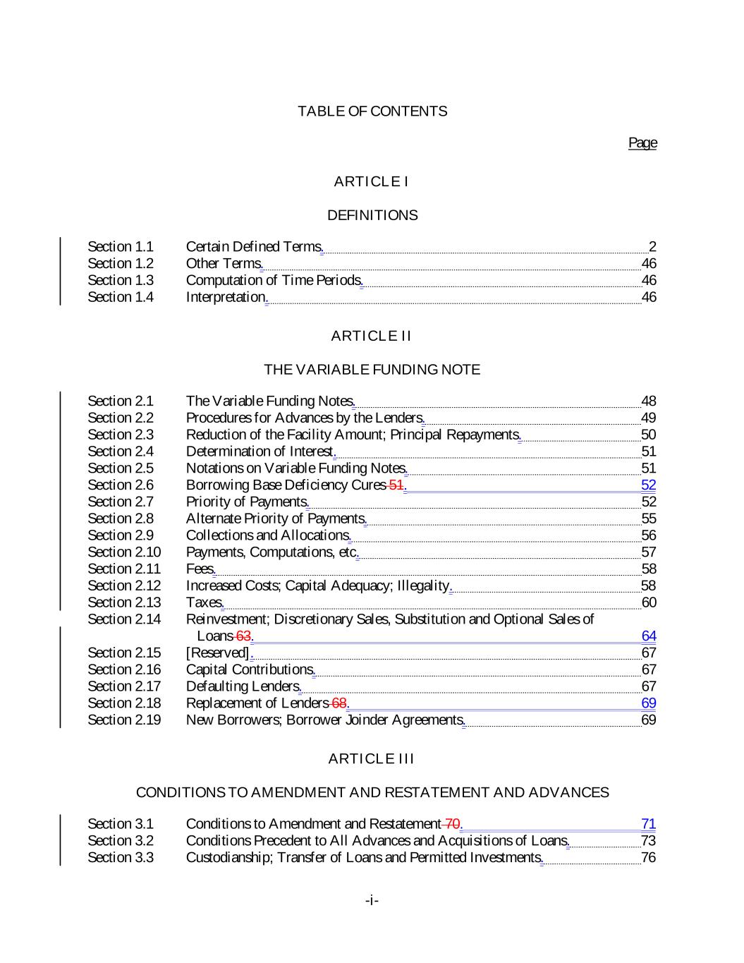 TABLE OF CONTENTS Page ARTICLE I DEFINITIONS Section 1.1 Certain Defined Terms. 2 Section 1.2 Other Terms. 46 Section 1.3 Computation of Time Periods. 46 Section 1.4 Interpretation. 46 ARTICLE II THE VARIABLE FUNDING NOTE Section 2.1 The Variable Funding Notes. 48 Section 2.2 Procedures for Advances by the Lenders. 49 Section 2.3 Reduction of the Facility Amount; Principal Repayments. 50 Section 2.4 Determination of Interest. 51 Section 2.5 Notations on Variable Funding Notes. 51 Section 2.6 Borrowing Base Deficiency Cures 51. 52 Section 2.7 Priority of Payments. 52 Section 2.8 Alternate Priority of Payments. 55 Section 2.9 Collections and Allocations. 56 Section 2.10 Payments, Computations, etc. 57 Section 2.11 Fees. 58 Section 2.12 Increased Costs; Capital Adequacy; Illegality. 58 Section 2.13 Taxes. 60 Section 2.14 Reinvestment; Discretionary Sales, Substitution and Optional Sales of Loans 63. 64 Section 2.15 [Reserved]. 67 Section 2.16 Capital Contributions. 67 Section 2.17 Defaulting Lenders. 67 Section 2.18 Replacement of Lenders 68. 69 Section 2.19 New Borrowers; Borrower Joinder Agreements. 69 ARTICLE III CONDITIONS TO AMENDMENT AND RESTATEMENT AND ADVANCES Section 3.1 Conditions to Amendment and Restatement 70. 71 Section 3.2 Conditions Precedent to All Advances and Acquisitions of Loans. 73 Section 3.3 Custodianship; Transfer of Loans and Permitted Investments. 76 -i-