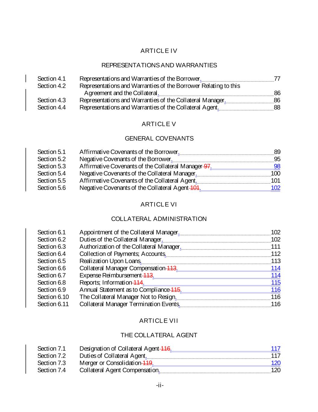 ARTICLE IV REPRESENTATIONS AND WARRANTIES Section 4.1 Representations and Warranties of the Borrower. 77 Section 4.2 Representations and Warranties of the Borrower Relating to this Agreement and the Collateral. 86 Section 4.3 Representations and Warranties of the Collateral Manager. 86 Section 4.4 Representations and Warranties of the Collateral Agent. 88 ARTICLE V GENERAL COVENANTS Section 5.1 Affirmative Covenants of the Borrower. 89 Section 5.2 Negative Covenants of the Borrower. 95 Section 5.3 Affirmative Covenants of the Collateral Manager 97. 98 Section 5.4 Negative Covenants of the Collateral Manager. 100 Section 5.5 Affirmative Covenants of the Collateral Agent. 101 Section 5.6 Negative Covenants of the Collateral Agent 101. 102 ARTICLE VI COLLATERAL ADMINISTRATION Section 6.1 Appointment of the Collateral Manager. 102 Section 6.2 Duties of the Collateral Manager. 102 Section 6.3 Authorization of the Collateral Manager. 111 Section 6.4 Collection of Payments; Accounts. 112 Section 6.5 Realization Upon Loans. 113 Section 6.6 Collateral Manager Compensation 113. 114 Section 6.7 Expense Reimbursement 113. 114 Section 6.8 Reports; Information 114. 115 Section 6.9 Annual Statement as to Compliance 115. 116 Section 6.10 The Collateral Manager Not to Resign. 116 Section 6.11 Collateral Manager Termination Events. 116 ARTICLE VII THE COLLATERAL AGENT Section 7.1 Designation of Collateral Agent 116. 117 Section 7.2 Duties of Collateral Agent. 117 Section 7.3 Merger or Consolidation 119. 120 Section 7.4 Collateral Agent Compensation. 120 -ii-