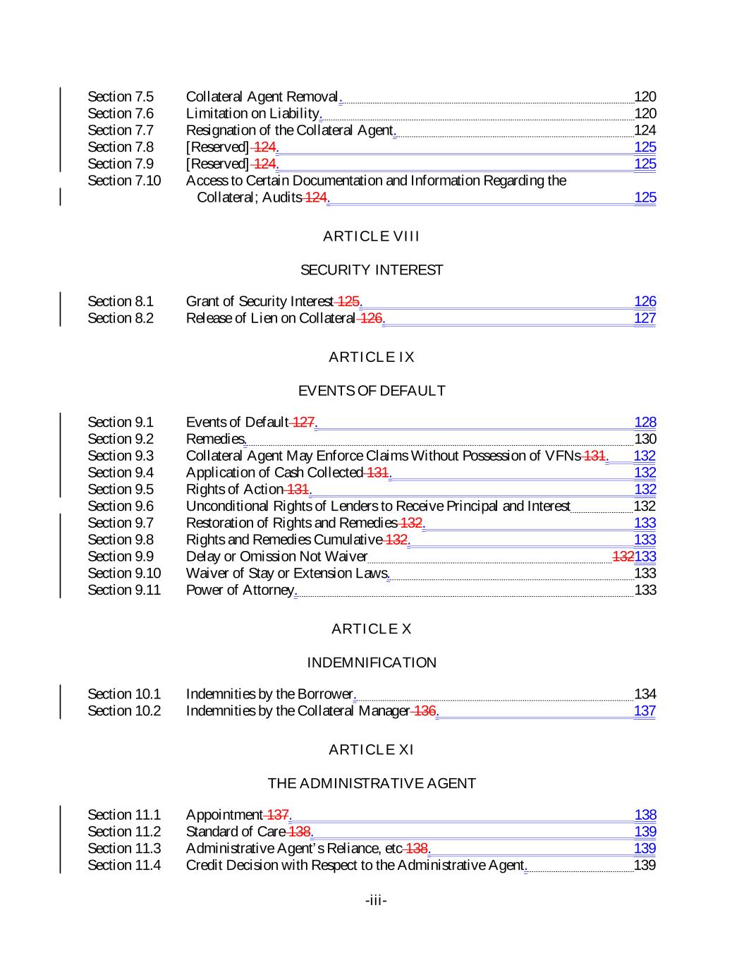 Section 7.5 Collateral Agent Removal. 120 Section 7.6 Limitation on Liability. 120 Section 7.7 Resignation of the Collateral Agent. 124 Section 7.8 [Reserved] 124. 125 Section 7.9 [Reserved] 124. 125 Section 7.10 Access to Certain Documentation and Information Regarding the Collateral; Audits 124. 125 ARTICLE VIII SECURITY INTEREST Section 8.1 Grant of Security Interest 125. 126 Section 8.2 Release of Lien on Collateral 126. 127 ARTICLE IX EVENTS OF DEFAULT Section 9.1 Events of Default 127. 128 Section 9.2 Remedies. 130 Section 9.3 Collateral Agent May Enforce Claims Without Possession of VFNs 131. 132 Section 9.4 Application of Cash Collected 131. 132 Section 9.5 Rights of Action 131. 132 Section 9.6 Unconditional Rights of Lenders to Receive Principal and Interest 132 Section 9.7 Restoration of Rights and Remedies 132. 133 Section 9.8 Rights and Remedies Cumulative 132. 133 Section 9.9 Delay or Omission Not Waiver 132133 Section 9.10 Waiver of Stay or Extension Laws. 133 Section 9.11 Power of Attorney. 133 ARTICLE X INDEMNIFICATION Section 10.1 Indemnities by the Borrower. 134 Section 10.2 Indemnities by the Collateral Manager 136. 137 ARTICLE XI THE ADMINISTRATIVE AGENT Section 11.1 Appointment 137. 138 Section 11.2 Standard of Care 138. 139 Section 11.3 Administrative Agent’s Reliance, etc 138. 139 Section 11.4 Credit Decision with Respect to the Administrative Agent. 139 -iii-