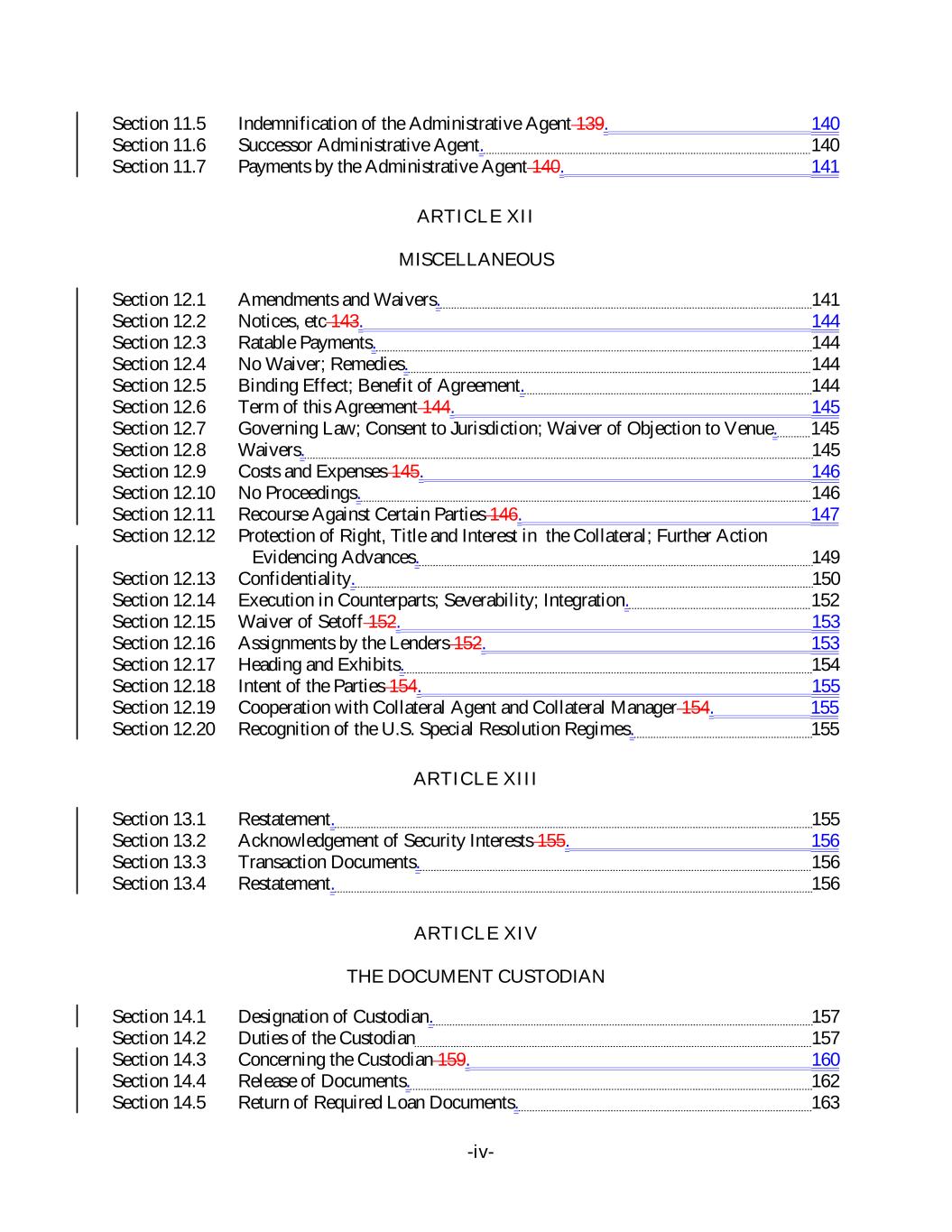 Section 11.5 Indemnification of the Administrative Agent 139. 140 Section 11.6 Successor Administrative Agent. 140 Section 11.7 Payments by the Administrative Agent 140. 141 ARTICLE XII MISCELLANEOUS Section 12.1 Amendments and Waivers. 141 Section 12.2 Notices, etc 143. 144 Section 12.3 Ratable Payments. 144 Section 12.4 No Waiver; Remedies. 144 Section 12.5 Binding Effect; Benefit of Agreement. 144 Section 12.6 Term of this Agreement 144. 145 Section 12.7 Governing Law; Consent to Jurisdiction; Waiver of Objection to Venue. 145 Section 12.8 Waivers. 145 Section 12.9 Costs and Expenses 145. 146 Section 12.10 No Proceedings. 146 Section 12.11 Recourse Against Certain Parties 146. 147 Section 12.12 Protection of Right, Title and Interest in the Collateral; Further Action Evidencing Advances. 149 Section 12.13 Confidentiality. 150 Section 12.14 Execution in Counterparts; Severability; Integration. 152 Section 12.15 Waiver of Setoff 152. 153 Section 12.16 Assignments by the Lenders 152. 153 Section 12.17 Heading and Exhibits. 154 Section 12.18 Intent of the Parties 154. 155 Section 12.19 Cooperation with Collateral Agent and Collateral Manager 154. 155 Section 12.20 Recognition of the U.S. Special Resolution Regimes. 155 ARTICLE XIII Section 13.1 Restatement. 155 Section 13.2 Acknowledgement of Security Interests 155. 156 Section 13.3 Transaction Documents. 156 Section 13.4 Restatement. 156 ARTICLE XIV THE DOCUMENT CUSTODIAN Section 14.1 Designation of Custodian. 157 Section 14.2 Duties of the Custodian 157 Section 14.3 Concerning the Custodian 159. 160 Section 14.4 Release of Documents. 162 Section 14.5 Return of Required Loan Documents. 163 -iv-