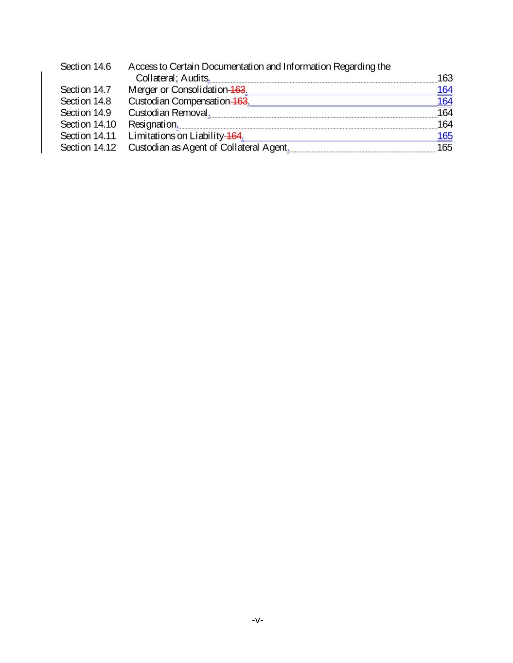 Section 14.6 Access to Certain Documentation and Information Regarding the Collateral; Audits. 163 Section 14.7 Merger or Consolidation 163. 164 Section 14.8 Custodian Compensation 163. 164 Section 14.9 Custodian Removal. 164 Section 14.10 Resignation. 164 Section 14.11 Limitations on Liability 164. 165 Section 14.12 Custodian as Agent of Collateral Agent. 165 -v-