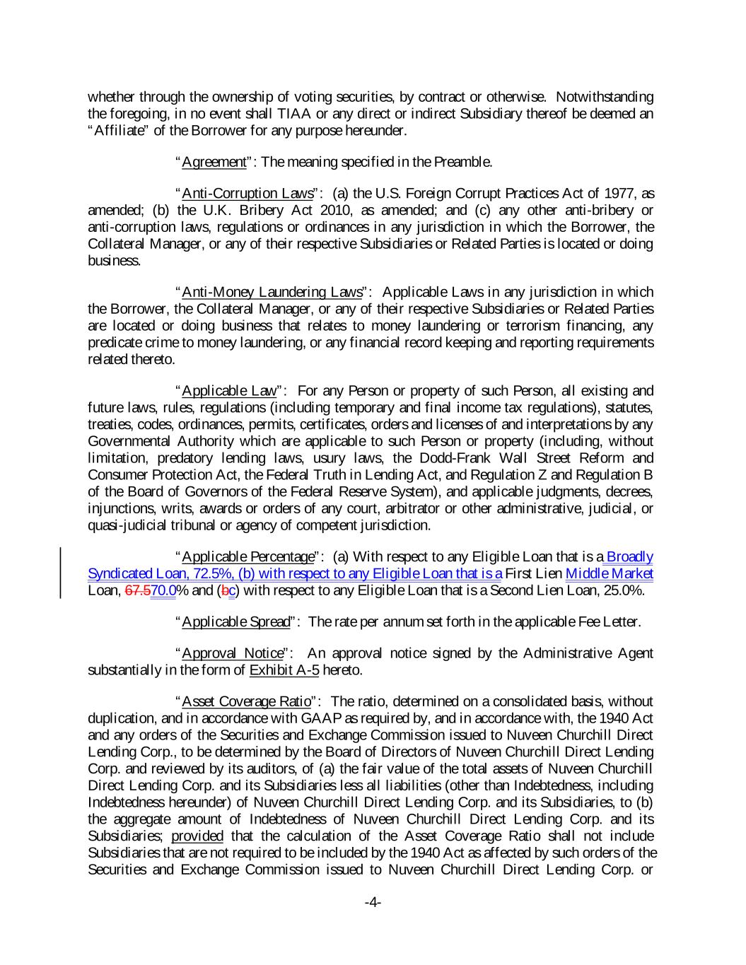 whether through the ownership of voting securities, by contract or otherwise. Notwithstanding the foregoing, in no event shall TIAA or any direct or indirect Subsidiary thereof be deemed an “Affiliate” of the Borrower for any purpose hereunder. “Agreement”: The meaning specified in the Preamble. “Anti-Corruption Laws”: (a) the U.S. Foreign Corrupt Practices Act of 1977, as amended; (b) the U.K. Bribery Act 2010, as amended; and (c) any other anti-bribery or anti-corruption laws, regulations or ordinances in any jurisdiction in which the Borrower, the Collateral Manager, or any of their respective Subsidiaries or Related Parties is located or doing business. “Anti-Money Laundering Laws”: Applicable Laws in any jurisdiction in which the Borrower, the Collateral Manager, or any of their respective Subsidiaries or Related Parties are located or doing business that relates to money laundering or terrorism financing, any predicate crime to money laundering, or any financial record keeping and reporting requirements related thereto. “Applicable Law”: For any Person or property of such Person, all existing and future laws, rules, regulations (including temporary and final income tax regulations), statutes, treaties, codes, ordinances, permits, certificates, orders and licenses of and interpretations by any Governmental Authority which are applicable to such Person or property (including, without limitation, predatory lending laws, usury laws, the Dodd-Frank Wall Street Reform and Consumer Protection Act, the Federal Truth in Lending Act, and Regulation Z and Regulation B of the Board of Governors of the Federal Reserve System), and applicable judgments, decrees, injunctions, writs, awards or orders of any court, arbitrator or other administrative, judicial, or quasi-judicial tribunal or agency of competent jurisdiction. “Applicable Percentage”: (a) With respect to any Eligible Loan that is a Broadly Syndicated Loan, 72.5%, (b) with respect to any Eligible Loan that is a First Lien Middle Market Loan, 67.570.0% and (bc) with respect to any Eligible Loan that is a Second Lien Loan, 25.0%. “Applicable Spread”: The rate per annum set forth in the applicable Fee Letter. “Approval Notice”: An approval notice signed by the Administrative Agent substantially in the form of Exhibit A-5 hereto. “Asset Coverage Ratio”: The ratio, determined on a consolidated basis, without duplication, and in accordance with GAAP as required by, and in accordance with, the 1940 Act and any orders of the Securities and Exchange Commission issued to Nuveen Churchill Direct Lending Corp., to be determined by the Board of Directors of Nuveen Churchill Direct Lending Corp. and reviewed by its auditors, of (a) the fair value of the total assets of Nuveen Churchill Direct Lending Corp. and its Subsidiaries less all liabilities (other than Indebtedness, including Indebtedness hereunder) of Nuveen Churchill Direct Lending Corp. and its Subsidiaries, to (b) the aggregate amount of Indebtedness of Nuveen Churchill Direct Lending Corp. and its Subsidiaries; provided that the calculation of the Asset Coverage Ratio shall not include Subsidiaries that are not required to be included by the 1940 Act as affected by such orders of the Securities and Exchange Commission issued to Nuveen Churchill Direct Lending Corp. or -4-