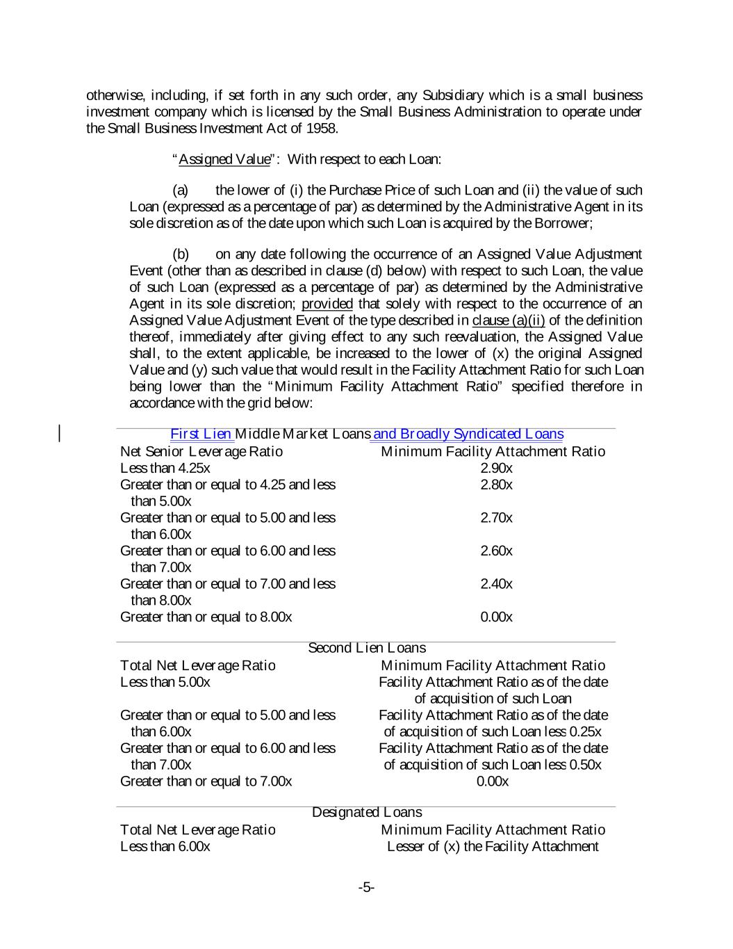 -5- 2.80x Second Lien Loans Total Net Leverage Ratio Minimum Facility Attachment Ratio Minimum Facility Attachment Ratio Greater than or equal to 5.00 and less than 6.00x Less than 5.00x 2.70x Facility Attachment Ratio as of the date of acquisition of such Loan Greater than or equal to 5.00 and less than 6.00x First Lien Middle Market Loans and Broadly Syndicated Loans Facility Attachment Ratio as of the date of acquisition of such Loan less 0.25x Greater than or equal to 6.00 and less than 7.00x Less than 4.25x Greater than or equal to 6.00 and less than 7.00x 2.60x Facility Attachment Ratio as of the date of acquisition of such Loan less 0.50x Greater than or equal to 7.00x 2.90x 0.00x Greater than or equal to 7.00 and less than 8.00x Designated Loans 2.40x Total Net Leverage Ratio Minimum Facility Attachment Ratio otherwise, including, if set forth in any such order, any Subsidiary which is a small business investment company which is licensed by the Small Business Administration to operate under the Small Business Investment Act of 1958. “Assigned Value”: With respect to each Loan: (a) the lower of (i) the Purchase Price of such Loan and (ii) the value of such Loan (expressed as a percentage of par) as determined by the Administrative Agent in its sole discretion as of the date upon which such Loan is acquired by the Borrower; (b) on any date following the occurrence of an Assigned Value Adjustment Event (other than as described in clause (d) below) with respect to such Loan, the value of such Loan (expressed as a percentage of par) as determined by the Administrative Agent in its sole discretion; provided that solely with respect to the occurrence of an Assigned Value Adjustment Event of the type described in clause (a)(ii) of the definition thereof, immediately after giving effect to any such reevaluation, the Assigned Value shall, to the extent applicable, be increased to the lower of (x) the original Assigned Value and (y) such value that would result in the Facility Attachment Ratio for such Loan being lower than the “Minimum Facility Attachment Ratio” specified therefore in accordance with the grid below: Greater than or equal to 8.00x Less than 6.00x Greater than or equal to 4.25 and less than 5.00x Lesser of (x) the Facility Attachment 0.00x Net Senior Leverage Ratio