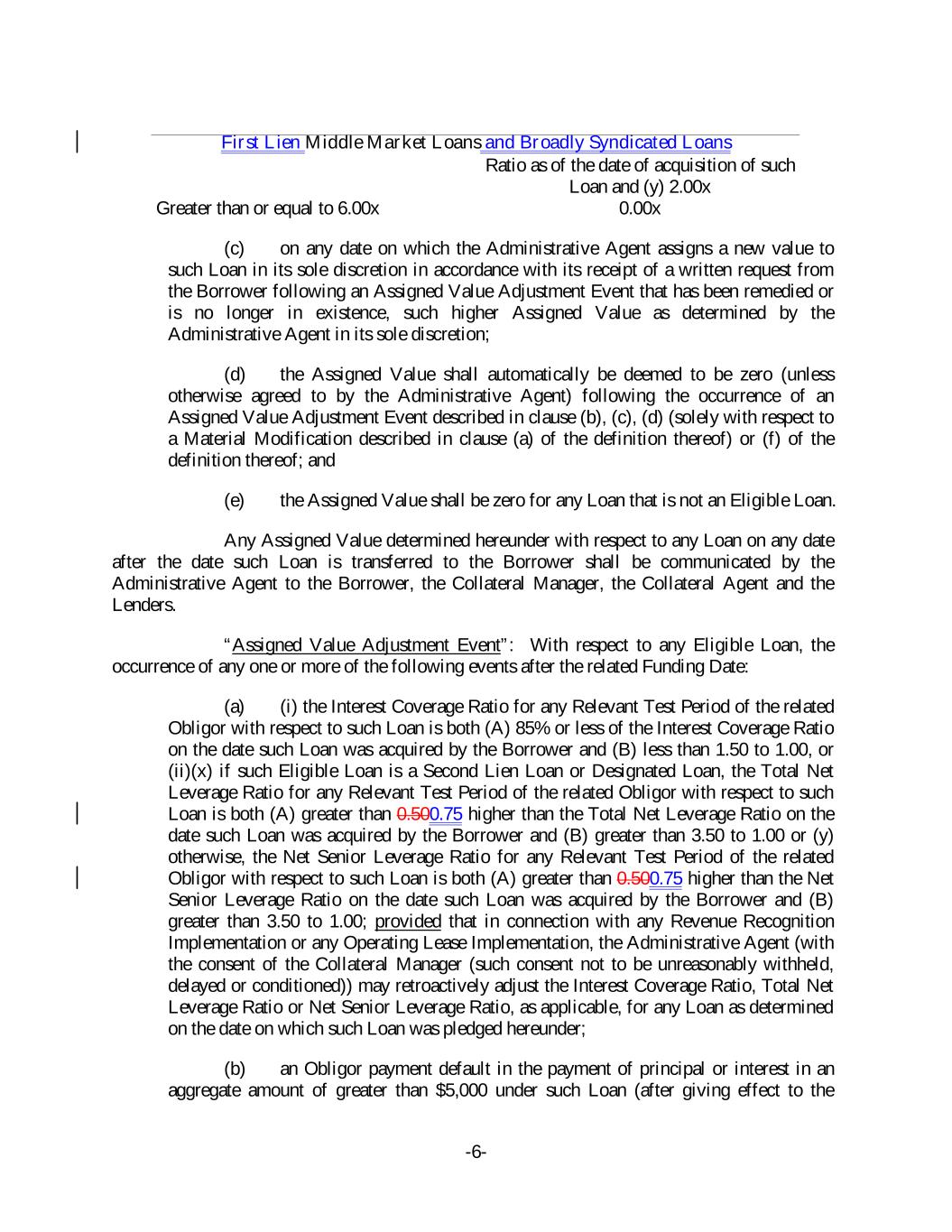 -6- Ratio as of the date of acquisition of such Loan and (y) 2.00x First Lien Middle Market Loans and Broadly Syndicated Loans Greater than or equal to 6.00x 0.00x (c) on any date on which the Administrative Agent assigns a new value to such Loan in its sole discretion in accordance with its receipt of a written request from the Borrower following an Assigned Value Adjustment Event that has been remedied or is no longer in existence, such higher Assigned Value as determined by the Administrative Agent in its sole discretion; (d) the Assigned Value shall automatically be deemed to be zero (unless otherwise agreed to by the Administrative Agent) following the occurrence of an Assigned Value Adjustment Event described in clause (b), (c), (d) (solely with respect to a Material Modification described in clause (a) of the definition thereof) or (f) of the definition thereof; and (e) the Assigned Value shall be zero for any Loan that is not an Eligible Loan. Any Assigned Value determined hereunder with respect to any Loan on any date after the date such Loan is transferred to the Borrower shall be communicated by the Administrative Agent to the Borrower, the Collateral Manager, the Collateral Agent and the Lenders. “Assigned Value Adjustment Event”: With respect to any Eligible Loan, the occurrence of any one or more of the following events after the related Funding Date: (a) (i) the Interest Coverage Ratio for any Relevant Test Period of the related Obligor with respect to such Loan is both (A) 85% or less of the Interest Coverage Ratio on the date such Loan was acquired by the Borrower and (B) less than 1.50 to 1.00, or (ii)(x) if such Eligible Loan is a Second Lien Loan or Designated Loan, the Total Net Leverage Ratio for any Relevant Test Period of the related Obligor with respect to such Loan is both (A) greater than 0.500.75 higher than the Total Net Leverage Ratio on the date such Loan was acquired by the Borrower and (B) greater than 3.50 to 1.00 or (y) otherwise, the Net Senior Leverage Ratio for any Relevant Test Period of the related Obligor with respect to such Loan is both (A) greater than 0.500.75 higher than the Net Senior Leverage Ratio on the date such Loan was acquired by the Borrower and (B) greater than 3.50 to 1.00; provided that in connection with any Revenue Recognition Implementation or any Operating Lease Implementation, the Administrative Agent (with the consent of the Collateral Manager (such consent not to be unreasonably withheld, delayed or conditioned)) may retroactively adjust the Interest Coverage Ratio, Total Net Leverage Ratio or Net Senior Leverage Ratio, as applicable, for any Loan as determined on the date on which such Loan was pledged hereunder; (b) an Obligor payment default in the payment of principal or interest in an aggregate amount of greater than $5,000 under such Loan (after giving effect to the