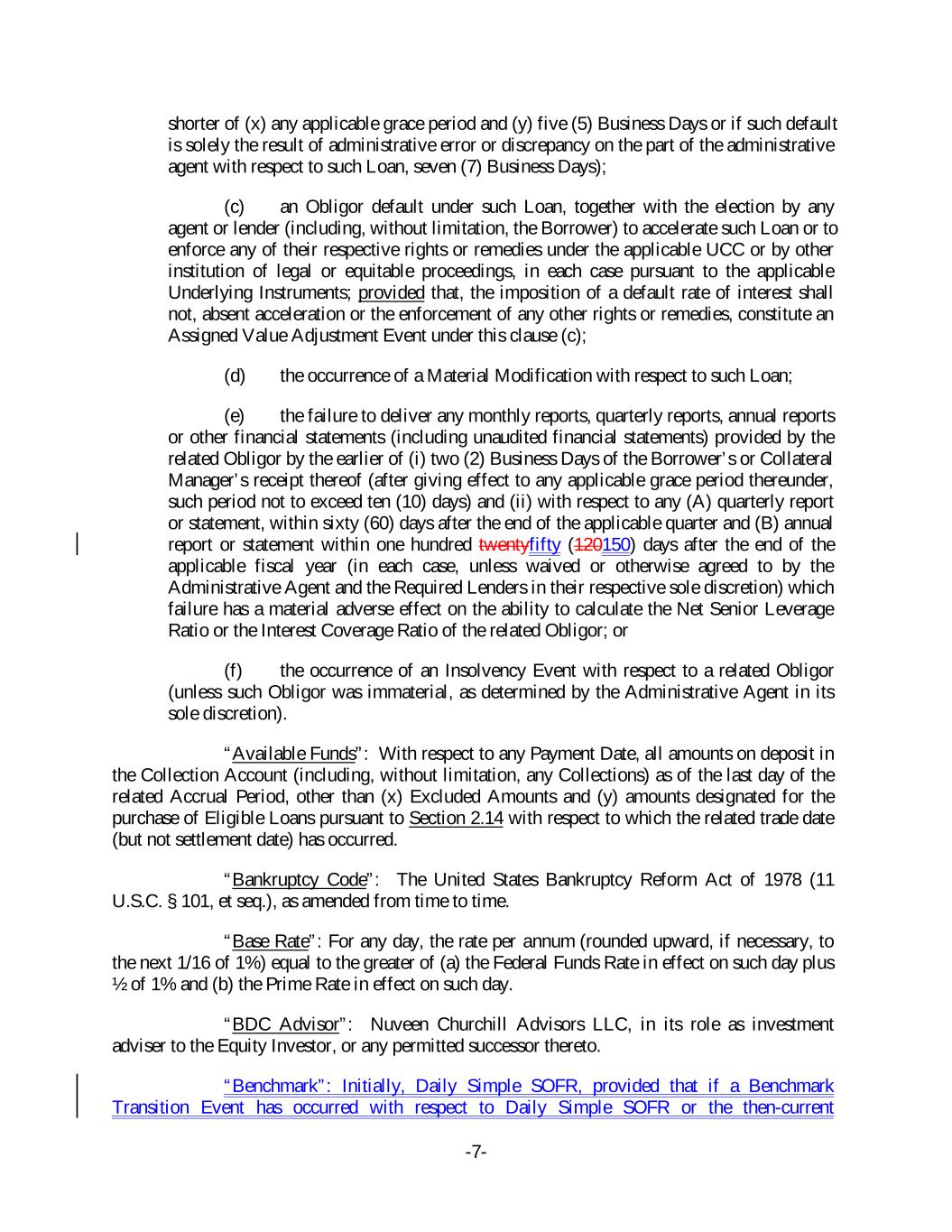 shorter of (x) any applicable grace period and (y) five (5) Business Days or if such default is solely the result of administrative error or discrepancy on the part of the administrative agent with respect to such Loan, seven (7) Business Days); (c) an Obligor default under such Loan, together with the election by any agent or lender (including, without limitation, the Borrower) to accelerate such Loan or to enforce any of their respective rights or remedies under the applicable UCC or by other institution of legal or equitable proceedings, in each case pursuant to the applicable Underlying Instruments; provided that, the imposition of a default rate of interest shall not, absent acceleration or the enforcement of any other rights or remedies, constitute an Assigned Value Adjustment Event under this clause (c); (d) the occurrence of a Material Modification with respect to such Loan; (e) the failure to deliver any monthly reports, quarterly reports, annual reports or other financial statements (including unaudited financial statements) provided by the related Obligor by the earlier of (i) two (2) Business Days of the Borrower’s or Collateral Manager’s receipt thereof (after giving effect to any applicable grace period thereunder, such period not to exceed ten (10) days) and (ii) with respect to any (A) quarterly report or statement, within sixty (60) days after the end of the applicable quarter and (B) annual report or statement within one hundred twentyfifty (120150) days after the end of the applicable fiscal year (in each case, unless waived or otherwise agreed to by the Administrative Agent and the Required Lenders in their respective sole discretion) which failure has a material adverse effect on the ability to calculate the Net Senior Leverage Ratio or the Interest Coverage Ratio of the related Obligor; or (f) the occurrence of an Insolvency Event with respect to a related Obligor (unless such Obligor was immaterial, as determined by the Administrative Agent in its sole discretion). “Available Funds”: With respect to any Payment Date, all amounts on deposit in the Collection Account (including, without limitation, any Collections) as of the last day of the related Accrual Period, other than (x) Excluded Amounts and (y) amounts designated for the purchase of Eligible Loans pursuant to Section 2.14 with respect to which the related trade date (but not settlement date) has occurred. “Bankruptcy Code”: The United States Bankruptcy Reform Act of 1978 (11 U.S.C. § 101, et seq.), as amended from time to time. “Base Rate”: For any day, the rate per annum (rounded upward, if necessary, to the next 1/16 of 1%) equal to the greater of (a) the Federal Funds Rate in effect on such day plus ½ of 1% and (b) the Prime Rate in effect on such day. “BDC Advisor”: Nuveen Churchill Advisors LLC, in its role as investment adviser to the Equity Investor, or any permitted successor thereto. “Benchmark”: Initially, Daily Simple SOFR, provided that if a Benchmark Transition Event has occurred with respect to Daily Simple SOFR or the then-current -7-