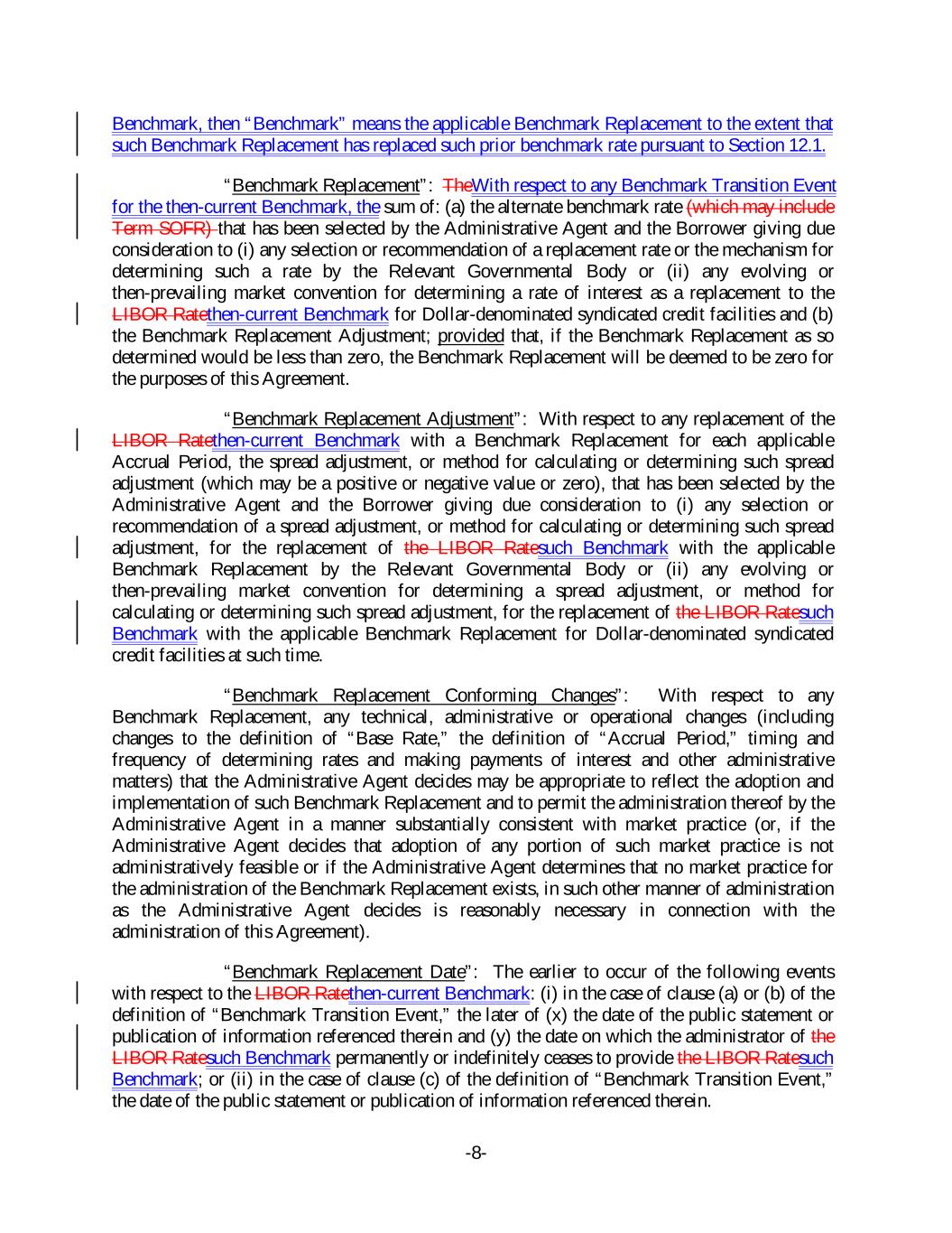 Benchmark, then “Benchmark” means the applicable Benchmark Replacement to the extent that such Benchmark Replacement has replaced such prior benchmark rate pursuant to Section 12.1. “Benchmark Replacement”: TheWith respect to any Benchmark Transition Event for the then-current Benchmark, the sum of: (a) the alternate benchmark rate (which may include Term SOFR) that has been selected by the Administrative Agent and the Borrower giving due consideration to (i) any selection or recommendation of a replacement rate or the mechanism for determining such a rate by the Relevant Governmental Body or (ii) any evolving or then-prevailing market convention for determining a rate of interest as a replacement to the LIBOR Ratethen-current Benchmark for Dollar-denominated syndicated credit facilities and (b) the Benchmark Replacement Adjustment; provided that, if the Benchmark Replacement as so determined would be less than zero, the Benchmark Replacement will be deemed to be zero for the purposes of this Agreement. “Benchmark Replacement Adjustment”: With respect to any replacement of the LIBOR Ratethen-current Benchmark with a Benchmark Replacement for each applicable Accrual Period, the spread adjustment, or method for calculating or determining such spread adjustment (which may be a positive or negative value or zero), that has been selected by the Administrative Agent and the Borrower giving due consideration to (i) any selection or recommendation of a spread adjustment, or method for calculating or determining such spread adjustment, for the replacement of the LIBOR Ratesuch Benchmark with the applicable Benchmark Replacement by the Relevant Governmental Body or (ii) any evolving or then-prevailing market convention for determining a spread adjustment, or method for calculating or determining such spread adjustment, for the replacement of the LIBOR Ratesuch Benchmark with the applicable Benchmark Replacement for Dollar-denominated syndicated credit facilities at such time. “Benchmark Replacement Conforming Changes”: With respect to any Benchmark Replacement, any technical, administrative or operational changes (including changes to the definition of “Base Rate,” the definition of “Accrual Period,” timing and frequency of determining rates and making payments of interest and other administrative matters) that the Administrative Agent decides may be appropriate to reflect the adoption and implementation of such Benchmark Replacement and to permit the administration thereof by the Administrative Agent in a manner substantially consistent with market practice (or, if the Administrative Agent decides that adoption of any portion of such market practice is not administratively feasible or if the Administrative Agent determines that no market practice for the administration of the Benchmark Replacement exists, in such other manner of administration as the Administrative Agent decides is reasonably necessary in connection with the administration of this Agreement). “Benchmark Replacement Date”: The earlier to occur of the following events with respect to the LIBOR Ratethen-current Benchmark: (i) in the case of clause (a) or (b) of the definition of “Benchmark Transition Event,” the later of (x) the date of the public statement or publication of information referenced therein and (y) the date on which the administrator of the LIBOR Ratesuch Benchmark permanently or indefinitely ceases to provide the LIBOR Ratesuch Benchmark; or (ii) in the case of clause (c) of the definition of “Benchmark Transition Event,” the date of the public statement or publication of information referenced therein. -8-