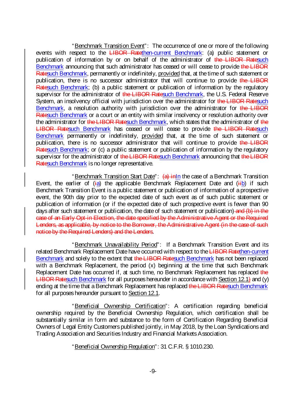 “Benchmark Transition Event”: The occurrence of one or more of the following events with respect to the LIBOR Ratethen-current Benchmark: (a) public statement or publication of information by or on behalf of the administrator of the LIBOR Ratesuch Benchmark announcing that such administrator has ceased or will cease to provide the LIBOR Ratesuch Benchmark, permanently or indefinitely, provided that, at the time of such statement or publication, there is no successor administrator that will continue to provide the LIBOR Ratesuch Benchmark; (b) a public statement or publication of information by the regulatory supervisor for the administrator of the LIBOR Ratesuch Benchmark, the U.S. Federal Reserve System, an insolvency official with jurisdiction over the administrator for the LIBOR Ratesuch Benchmark, a resolution authority with jurisdiction over the administrator for the LIBOR Ratesuch Benchmark or a court or an entity with similar insolvency or resolution authority over the administrator for the LIBOR Ratesuch Benchmark, which states that the administrator of the LIBOR Ratesuch Benchmark has ceased or will cease to provide the LIBOR Ratesuch Benchmark permanently or indefinitely, provided that, at the time of such statement or publication, there is no successor administrator that will continue to provide the LIBOR Ratesuch Benchmark; or (c) a public statement or publication of information by the regulatory supervisor for the administrator of the LIBOR Ratesuch Benchmark announcing that the LIBOR Ratesuch Benchmark is no longer representative. “Benchmark Transition Start Date”: (a) inIn the case of a Benchmark Transition Event, the earlier of (ia) the applicable Benchmark Replacement Date and (iib) if such Benchmark Transition Event is a public statement or publication of information of a prospective event, the 90th day prior to the expected date of such event as of such public statement or publication of information (or if the expected date of such prospective event is fewer than 90 days after such statement or publication, the date of such statement or publication) and (b) in the case of an Early Opt-in Election, the date specified by the Administrative Agent or the Required Lenders, as applicable, by notice to the Borrower, the Administrative Agent (in the case of such notice by the Required Lenders) and the Lenders. “Benchmark Unavailability Period”: If a Benchmark Transition Event and its related Benchmark Replacement Date have occurred with respect to the LIBOR Ratethen-current Benchmark and solely to the extent that the LIBOR Ratesuch Benchmark has not been replaced with a Benchmark Replacement, the period (x) beginning at the time that such Benchmark Replacement Date has occurred if, at such time, no Benchmark Replacement has replaced the LIBOR Ratesuch Benchmark for all purposes hereunder in accordance with Section 12.1) and (y) ending at the time that a Benchmark Replacement has replaced the LIBOR Ratesuch Benchmark for all purposes hereunder pursuant to Section 12.1. “Beneficial Ownership Certification”: A certification regarding beneficial ownership required by the Beneficial Ownership Regulation, which certification shall be substantially similar in form and substance to the form of Certification Regarding Beneficial Owners of Legal Entity Customers published jointly, in May 2018, by the Loan Syndications and Trading Association and Securities Industry and Financial Markets Association. “Beneficial Ownership Regulation”: 31 C.F.R. § 1010.230. -9-