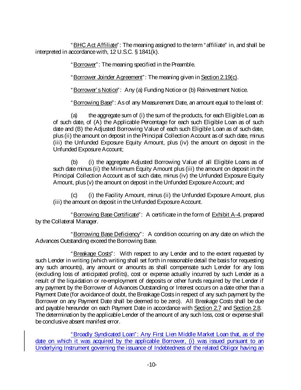 “BHC Act Affiliate”: The meaning assigned to the term “affiliate” in, and shall be interpreted in accordance with, 12 U.S.C. § 1841(k). “Borrower”: The meaning specified in the Preamble. “Borrower Joinder Agreement”: The meaning given in Section 2.19(c). “Borrower’s Notice”: Any (a) Funding Notice or (b) Reinvestment Notice. “Borrowing Base”: As of any Measurement Date, an amount equal to the least of: (a) the aggregate sum of (i) the sum of the products, for each Eligible Loan as of such date, of (A) the Applicable Percentage for each such Eligible Loan as of such date and (B) the Adjusted Borrowing Value of each such Eligible Loan as of such date, plus (ii) the amount on deposit in the Principal Collection Account as of such date, minus (iii) the Unfunded Exposure Equity Amount, plus (iv) the amount on deposit in the Unfunded Exposure Account; (b) (i) the aggregate Adjusted Borrowing Value of all Eligible Loans as of such date minus (ii) the Minimum Equity Amount plus (iii) the amount on deposit in the Principal Collection Account as of such date, minus (iv) the Unfunded Exposure Equity Amount, plus (v) the amount on deposit in the Unfunded Exposure Account; and (c) (i) the Facility Amount, minus (ii) the Unfunded Exposure Amount, plus (iii) the amount on deposit in the Unfunded Exposure Account. “Borrowing Base Certificate”: A certificate in the form of Exhibit A-4, prepared by the Collateral Manager. “Borrowing Base Deficiency”: A condition occurring on any date on which the Advances Outstanding exceed the Borrowing Base. “Breakage Costs”: With respect to any Lender and to the extent requested by such Lender in writing (which writing shall set forth in reasonable detail the basis for requesting any such amounts), any amount or amounts as shall compensate such Lender for any loss (excluding loss of anticipated profits), cost or expense actually incurred by such Lender as a result of the liquidation or re-employment of deposits or other funds required by the Lender if any payment by the Borrower of Advances Outstanding or Interest occurs on a date other than a Payment Date (for avoidance of doubt, the Breakage Costs in respect of any such payment by the Borrower on any Payment Date shall be deemed to be zero). All Breakage Costs shall be due and payable hereunder on each Payment Date in accordance with Section 2.7 and Section 2.8. The determination by the applicable Lender of the amount of any such loss, cost or expense shall be conclusive absent manifest error. “Broadly Syndicated Loan”: Any First Lien Middle Market Loan that, as of the date on which it was acquired by the applicable Borrower, (i) was issued pursuant to an Underlying Instrument governing the issuance of Indebtedness of the related Obligor having an -10-