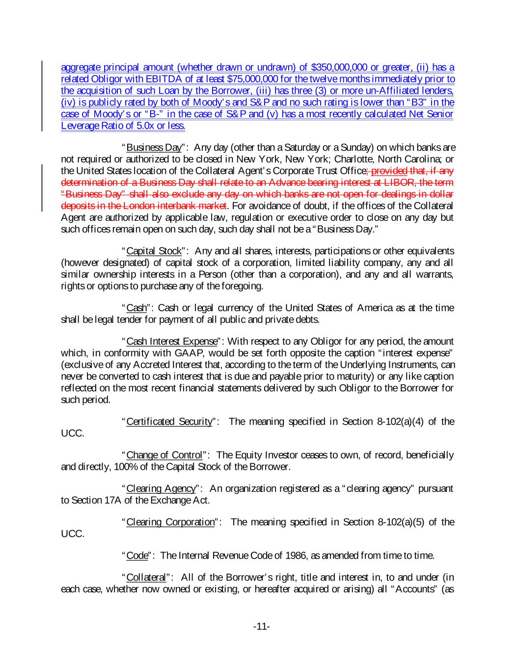 aggregate principal amount (whether drawn or undrawn) of $350,000,000 or greater, (ii) has a related Obligor with EBITDA of at least $75,000,000 for the twelve months immediately prior to the acquisition of such Loan by the Borrower, (iii) has three (3) or more un-Affiliated lenders, (iv) is publicly rated by both of Moody’s and S&P and no such rating is lower than “B3” in the case of Moody’s or “B-” in the case of S&P and (v) has a most recently calculated Net Senior Leverage Ratio of 5.0x or less. “Business Day”: Any day (other than a Saturday or a Sunday) on which banks are not required or authorized to be closed in New York, New York; Charlotte, North Carolina; or the United States location of the Collateral Agent’s Corporate Trust Office; provided that, if any determination of a Business Day shall relate to an Advance bearing interest at LIBOR, the term “Business Day” shall also exclude any day on which banks are not open for dealings in dollar deposits in the London interbank market. For avoidance of doubt, if the offices of the Collateral Agent are authorized by applicable law, regulation or executive order to close on any day but such offices remain open on such day, such day shall not be a “Business Day.” “Capital Stock”: Any and all shares, interests, participations or other equivalents (however designated) of capital stock of a corporation, limited liability company, any and all similar ownership interests in a Person (other than a corporation), and any and all warrants, rights or options to purchase any of the foregoing. “Cash”: Cash or legal currency of the United States of America as at the time shall be legal tender for payment of all public and private debts. “Cash Interest Expense”: With respect to any Obligor for any period, the amount which, in conformity with GAAP, would be set forth opposite the caption “interest expense” (exclusive of any Accreted Interest that, according to the term of the Underlying Instruments, can never be converted to cash interest that is due and payable prior to maturity) or any like caption reflected on the most recent financial statements delivered by such Obligor to the Borrower for such period. “Certificated Security”: The meaning specified in Section 8-102(a)(4) of the UCC. “Change of Control”: The Equity Investor ceases to own, of record, beneficially and directly, 100% of the Capital Stock of the Borrower. “Clearing Agency”: An organization registered as a “clearing agency” pursuant to Section 17A of the Exchange Act. “Clearing Corporation”: The meaning specified in Section 8-102(a)(5) of the UCC. “Code”: The Internal Revenue Code of 1986, as amended from time to time. “Collateral”: All of the Borrower’s right, title and interest in, to and under (in each case, whether now owned or existing, or hereafter acquired or arising) all “Accounts” (as -11-