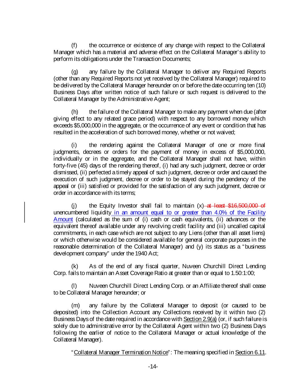 (f) the occurrence or existence of any change with respect to the Collateral Manager which has a material and adverse effect on the Collateral Manager’s ability to perform its obligations under the Transaction Documents; (g) any failure by the Collateral Manager to deliver any Required Reports (other than any Required Reports not yet received by the Collateral Manager) required to be delivered by the Collateral Manager hereunder on or before the date occurring ten (10) Business Days after written notice of such failure or such request is delivered to the Collateral Manager by the Administrative Agent; (h) the failure of the Collateral Manager to make any payment when due (after giving effect to any related grace period) with respect to any borrowed money which exceeds $5,000,000 in the aggregate, or the occurrence of any event or condition that has resulted in the acceleration of such borrowed money, whether or not waived; (i) the rendering against the Collateral Manager of one or more final judgments, decrees or orders for the payment of money in excess of $5,000,000, individually or in the aggregate, and the Collateral Manager shall not have, within forty-five (45) days of the rendering thereof, (i) had any such judgment, decree or order dismissed, (ii) perfected a timely appeal of such judgment, decree or order and caused the execution of such judgment, decree or order to be stayed during the pendency of the appeal or (iii) satisfied or provided for the satisfaction of any such judgment, decree or order in accordance with its terms; (j) the Equity Investor shall fail to maintain (x) at least $16,500,000 of unencumbered liquidity in an amount equal to or greater than 4.0% of the Facility Amount (calculated as the sum of (i) cash or cash equivalents, (ii) advances or the equivalent thereof available under any revolving credit facility and (iii) uncalled capital commitments, in each case which are not subject to any Liens (other than all asset liens) or which otherwise would be considered available for general corporate purposes in the reasonable determination of the Collateral Manager) and (y) its status as a “business development company” under the 1940 Act; (k) As of the end of any fiscal quarter, Nuveen Churchill Direct Lending Corp. fails to maintain an Asset Coverage Ratio at greater than or equal to 1.50:1:00; (l) Nuveen Churchill Direct Lending Corp. or an Affiliate thereof shall cease to be Collateral Manager hereunder; or (m) any failure by the Collateral Manager to deposit (or caused to be deposited) into the Collection Account any Collections received by it within two (2) Business Days of the date required in accordance with Section 2.9(a) (or, if such failure is solely due to administrative error by the Collateral Agent within two (2) Business Days following the earlier of notice to the Collateral Manager or actual knowledge of the Collateral Manager). “Collateral Manager Termination Notice”: The meaning specified in Section 6.11. -14-