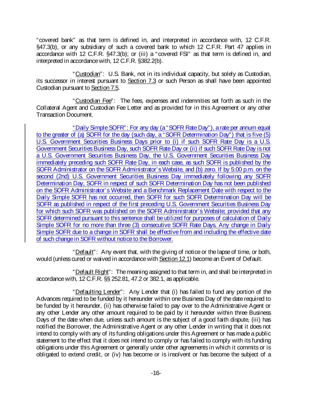 “covered bank” as that term is defined in, and interpreted in accordance with, 12 C.F.R. §47.3(b), or any subsidiary of such a covered bank to which 12 C.F.R. Part 47 applies in accordance with 12 C.F.R. §47.3(b); or (iii) a “covered FSI” as that term is defined in, and interpreted in accordance with, 12 C.F.R. §382.2(b). “Custodian”: U.S. Bank, not in its individual capacity, but solely as Custodian, its successor in interest pursuant to Section 7.3 or such Person as shall have been appointed Custodian pursuant to Section 7.5. “Custodian Fee”: The fees, expenses and indemnities set forth as such in the Collateral Agent and Custodian Fee Letter and as provided for in this Agreement or any other Transaction Document. “Daily Simple SOFR”: For any day (a “SOFR Rate Day”), a rate per annum equal to the greater of (a) SOFR for the day (such day, a “SOFR Determination Day”) that is five (5) U.S. Government Securities Business Days prior to (i) if such SOFR Rate Day is a U.S. Government Securities Business Day, such SOFR Rate Day or (ii) if such SOFR Rate Day is not a U.S. Government Securities Business Day, the U.S. Government Securities Business Day immediately preceding such SOFR Rate Day, in each case, as such SOFR is published by the SOFR Administrator on the SOFR Administrator’s Website, and (b) zero. If by 5:00 p.m. on the second (2nd) U.S. Government Securities Business Day immediately following any SOFR Determination Day, SOFR in respect of such SOFR Determination Day has not been published on the SOFR Administrator’s Website and a Benchmark Replacement Date with respect to the Daily Simple SOFR has not occurred, then SOFR for such SOFR Determination Day will be SOFR as published in respect of the first preceding U.S. Government Securities Business Day for which such SOFR was published on the SOFR Administrator’s Website; provided that any SOFR determined pursuant to this sentence shall be utilized for purposes of calculation of Daily Simple SOFR for no more than three (3) consecutive SOFR Rate Days. Any change in Daily Simple SOFR due to a change in SOFR shall be effective from and including the effective date of such change in SOFR without notice to the Borrower. “Default”: Any event that, with the giving of notice or the lapse of time, or both, would (unless cured or waived in accordance with Section 12.1) become an Event of Default. “Default Right”: The meaning assigned to that term in, and shall be interpreted in accordance with, 12 C.F.R. §§ 252.81, 47.2 or 382.1, as applicable. “Defaulting Lender”: Any Lender that (i) has failed to fund any portion of the Advances required to be funded by it hereunder within one Business Day of the date required to be funded by it hereunder, (ii) has otherwise failed to pay over to the Administrative Agent or any other Lender any other amount required to be paid by it hereunder within three Business Days of the date when due, unless such amount is the subject of a good faith dispute, (iii) has notified the Borrower, the Administrative Agent or any other Lender in writing that it does not intend to comply with any of its funding obligations under this Agreement or has made a public statement to the effect that it does not intend to comply or has failed to comply with its funding obligations under this Agreement or generally under other agreements in which it commits or is obligated to extend credit, or (iv) has become or is insolvent or has become the subject of a -16-