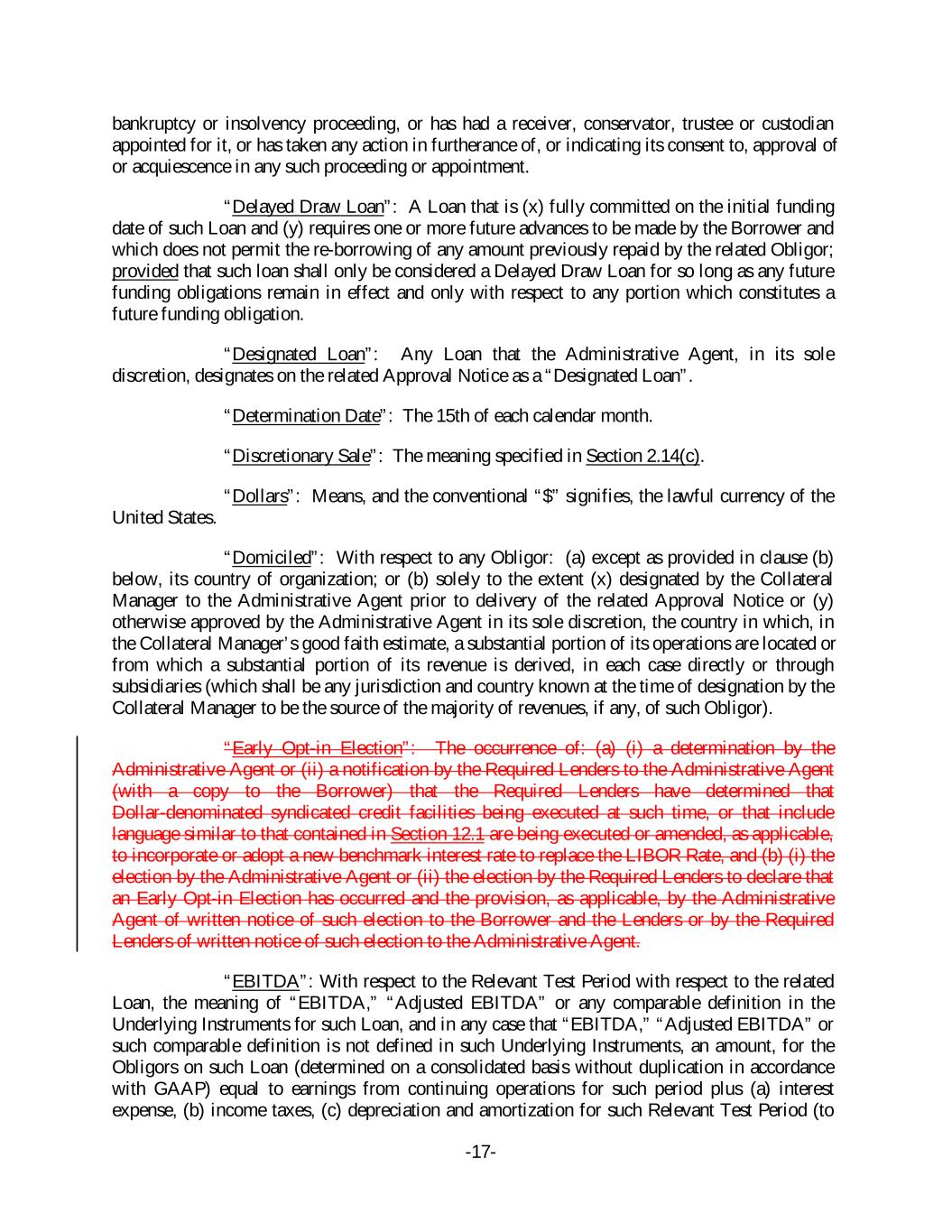 bankruptcy or insolvency proceeding, or has had a receiver, conservator, trustee or custodian appointed for it, or has taken any action in furtherance of, or indicating its consent to, approval of or acquiescence in any such proceeding or appointment. “Delayed Draw Loan”: A Loan that is (x) fully committed on the initial funding date of such Loan and (y) requires one or more future advances to be made by the Borrower and which does not permit the re-borrowing of any amount previously repaid by the related Obligor; provided that such loan shall only be considered a Delayed Draw Loan for so long as any future funding obligations remain in effect and only with respect to any portion which constitutes a future funding obligation. “Designated Loan”: Any Loan that the Administrative Agent, in its sole discretion, designates on the related Approval Notice as a “Designated Loan”. “Determination Date”: The 15th of each calendar month. “Discretionary Sale”: The meaning specified in Section 2.14(c). “Dollars”: Means, and the conventional “$” signifies, the lawful currency of the United States. “Domiciled”: With respect to any Obligor: (a) except as provided in clause (b) below, its country of organization; or (b) solely to the extent (x) designated by the Collateral Manager to the Administrative Agent prior to delivery of the related Approval Notice or (y) otherwise approved by the Administrative Agent in its sole discretion, the country in which, in the Collateral Manager’s good faith estimate, a substantial portion of its operations are located or from which a substantial portion of its revenue is derived, in each case directly or through subsidiaries (which shall be any jurisdiction and country known at the time of designation by the Collateral Manager to be the source of the majority of revenues, if any, of such Obligor). “Early Opt-in Election”: The occurrence of: (a) (i) a determination by the Administrative Agent or (ii) a notification by the Required Lenders to the Administrative Agent (with a copy to the Borrower) that the Required Lenders have determined that Dollar-denominated syndicated credit facilities being executed at such time, or that include language similar to that contained in Section 12.1 are being executed or amended, as applicable, to incorporate or adopt a new benchmark interest rate to replace the LIBOR Rate, and (b) (i) the election by the Administrative Agent or (ii) the election by the Required Lenders to declare that an Early Opt-in Election has occurred and the provision, as applicable, by the Administrative Agent of written notice of such election to the Borrower and the Lenders or by the Required Lenders of written notice of such election to the Administrative Agent. “EBITDA”: With respect to the Relevant Test Period with respect to the related Loan, the meaning of “EBITDA,” “Adjusted EBITDA” or any comparable definition in the Underlying Instruments for such Loan, and in any case that “EBITDA,” “Adjusted EBITDA” or such comparable definition is not defined in such Underlying Instruments, an amount, for the Obligors on such Loan (determined on a consolidated basis without duplication in accordance with GAAP) equal to earnings from continuing operations for such period plus (a) interest expense, (b) income taxes, (c) depreciation and amortization for such Relevant Test Period (to -17-