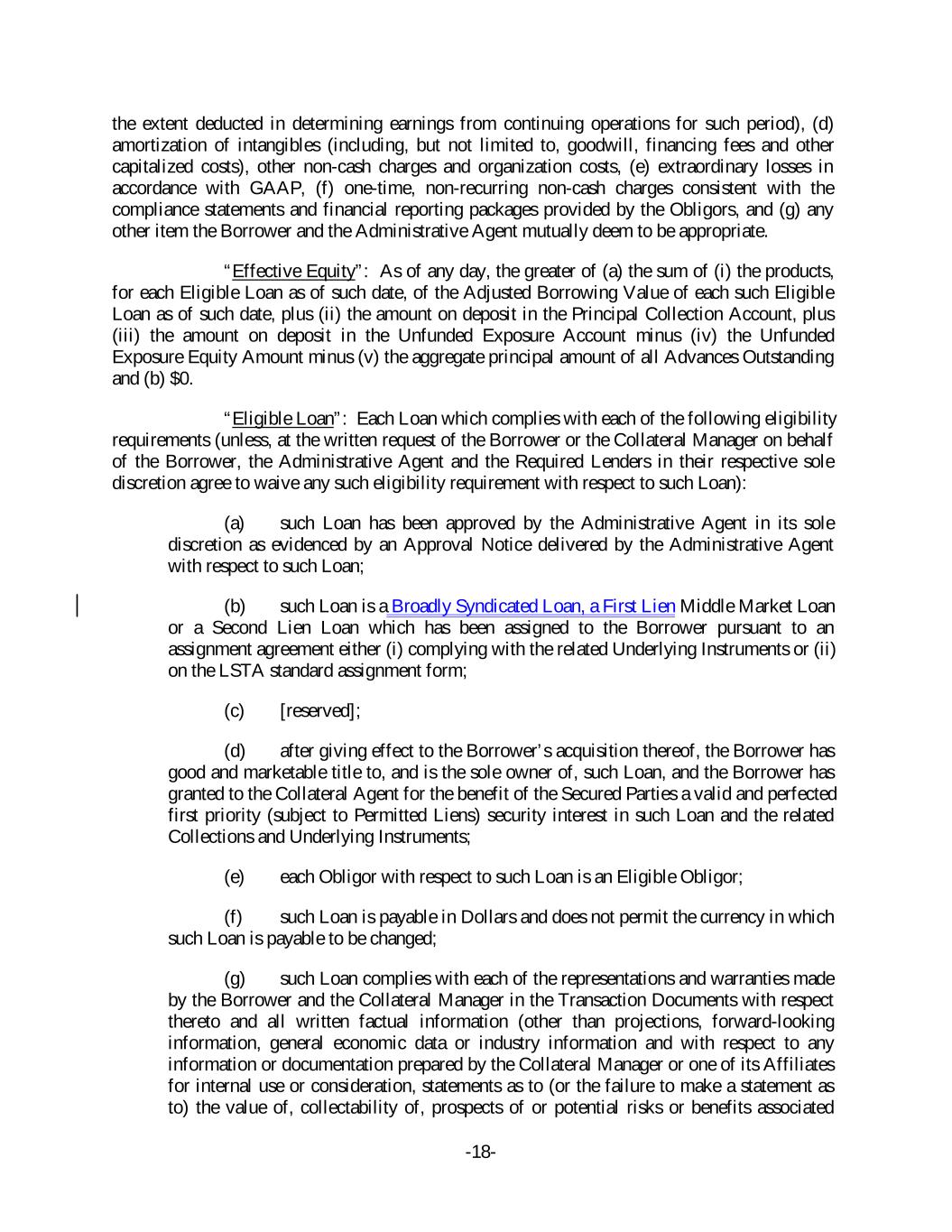 the extent deducted in determining earnings from continuing operations for such period), (d) amortization of intangibles (including, but not limited to, goodwill, financing fees and other capitalized costs), other non-cash charges and organization costs, (e) extraordinary losses in accordance with GAAP, (f) one-time, non-recurring non-cash charges consistent with the compliance statements and financial reporting packages provided by the Obligors, and (g) any other item the Borrower and the Administrative Agent mutually deem to be appropriate. “Effective Equity”: As of any day, the greater of (a) the sum of (i) the products, for each Eligible Loan as of such date, of the Adjusted Borrowing Value of each such Eligible Loan as of such date, plus (ii) the amount on deposit in the Principal Collection Account, plus (iii) the amount on deposit in the Unfunded Exposure Account minus (iv) the Unfunded Exposure Equity Amount minus (v) the aggregate principal amount of all Advances Outstanding and (b) $0. “Eligible Loan”: Each Loan which complies with each of the following eligibility requirements (unless, at the written request of the Borrower or the Collateral Manager on behalf of the Borrower, the Administrative Agent and the Required Lenders in their respective sole discretion agree to waive any such eligibility requirement with respect to such Loan): (a) such Loan has been approved by the Administrative Agent in its sole discretion as evidenced by an Approval Notice delivered by the Administrative Agent with respect to such Loan; (b) such Loan is a Broadly Syndicated Loan, a First Lien Middle Market Loan or a Second Lien Loan which has been assigned to the Borrower pursuant to an assignment agreement either (i) complying with the related Underlying Instruments or (ii) on the LSTA standard assignment form; (c) [reserved]; (d) after giving effect to the Borrower’s acquisition thereof, the Borrower has good and marketable title to, and is the sole owner of, such Loan, and the Borrower has granted to the Collateral Agent for the benefit of the Secured Parties a valid and perfected first priority (subject to Permitted Liens) security interest in such Loan and the related Collections and Underlying Instruments; (e) each Obligor with respect to such Loan is an Eligible Obligor; (f) such Loan is payable in Dollars and does not permit the currency in which such Loan is payable to be changed; (g) such Loan complies with each of the representations and warranties made by the Borrower and the Collateral Manager in the Transaction Documents with respect thereto and all written factual information (other than projections, forward-looking information, general economic data or industry information and with respect to any information or documentation prepared by the Collateral Manager or one of its Affiliates for internal use or consideration, statements as to (or the failure to make a statement as to) the value of, collectability of, prospects of or potential risks or benefits associated -18-